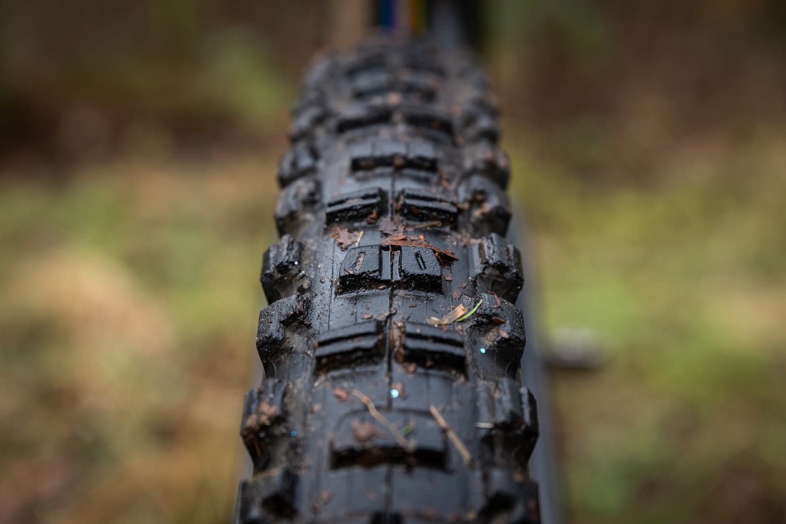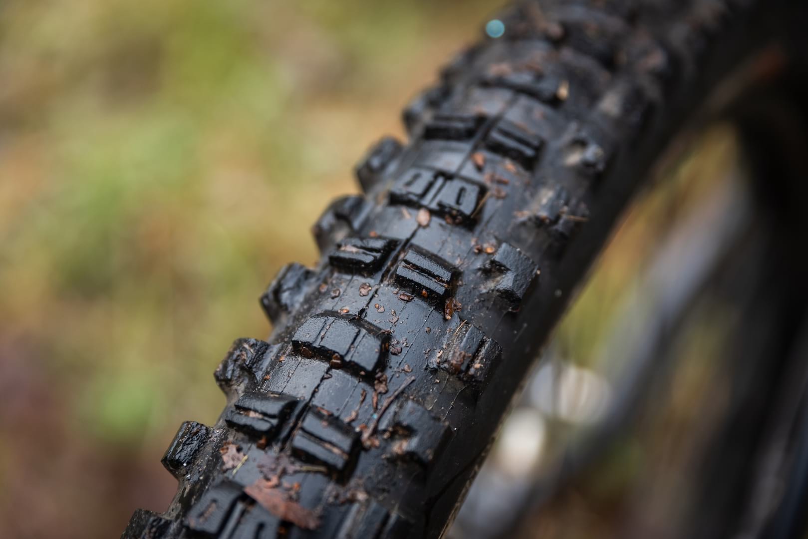 This has to be one of the best cornering tyres I’ve used – it is utterly reliable and sure-footed on a variety of trail surfaces. The combination of those slightly wider DHF cornering blocks with the deeper centre tread gives tonnes of traction, even when the rocks are big, loose and surrounded by scrabbly dirt or mud.
