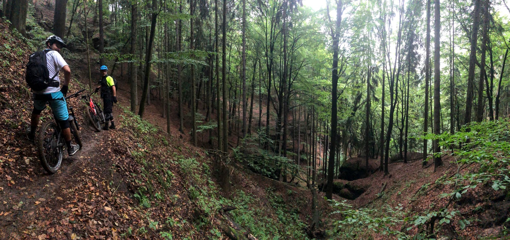 These weren’t bike trails like at Nové Město, these were shared walking trails, in places shaped and cared for by the mountain biking community. The contouring trails were fun, although the drops off the side were slightly disconcerting. Like Singltrek pod Smrken, these trails were narrow. But it was the odd little steep section that really floated my boat – BC-style, steep bouldery drop-ins that tested balance and nerve. And definitely required a bit of butt-buzzing at times.