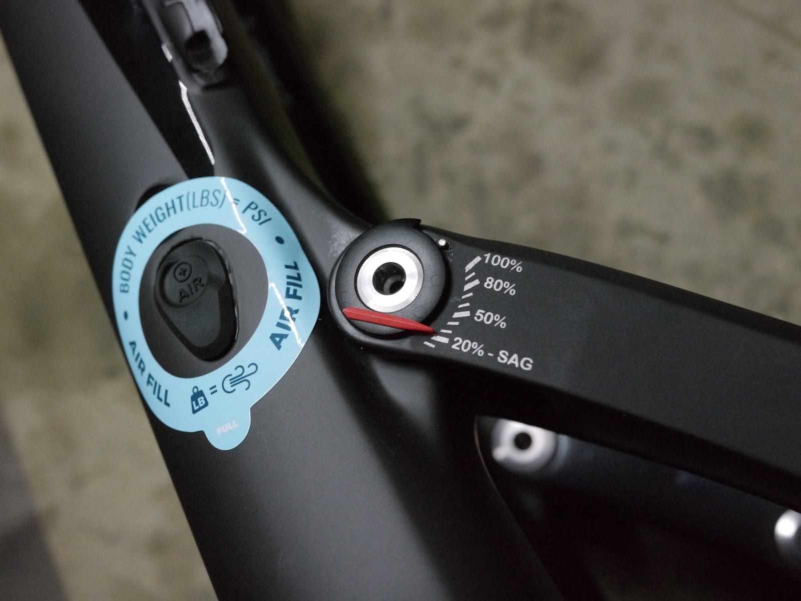 There’s a nifty sag and travel indicator on the side of the fork, where a little stud rotates a dial with a needle on it. A first test at their recommended air pressure revealed that, yes, it put me exactly at the recommended 20% sag.