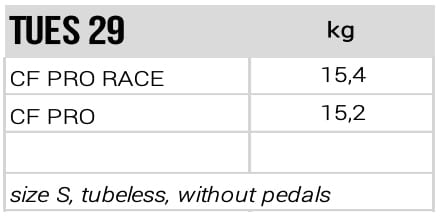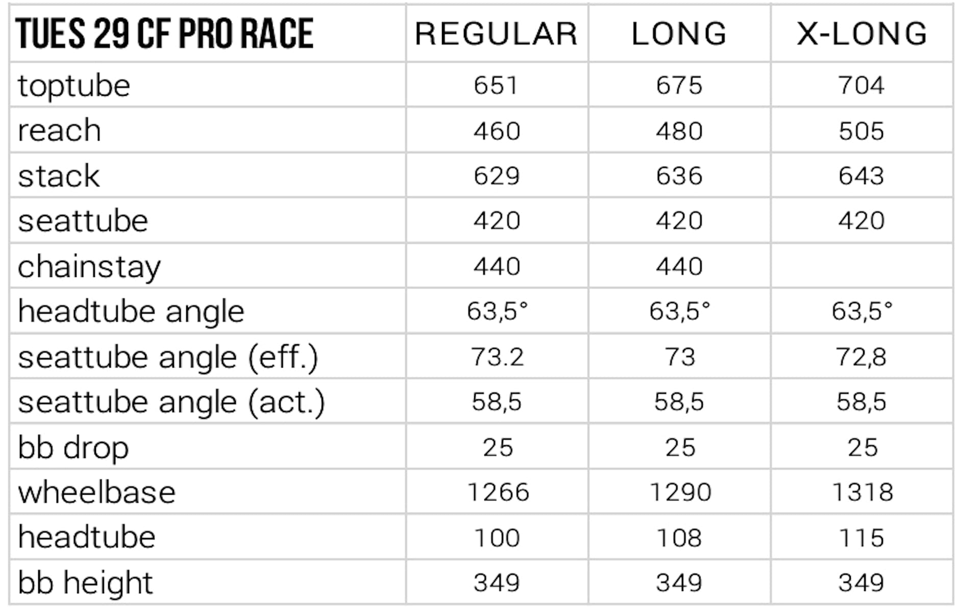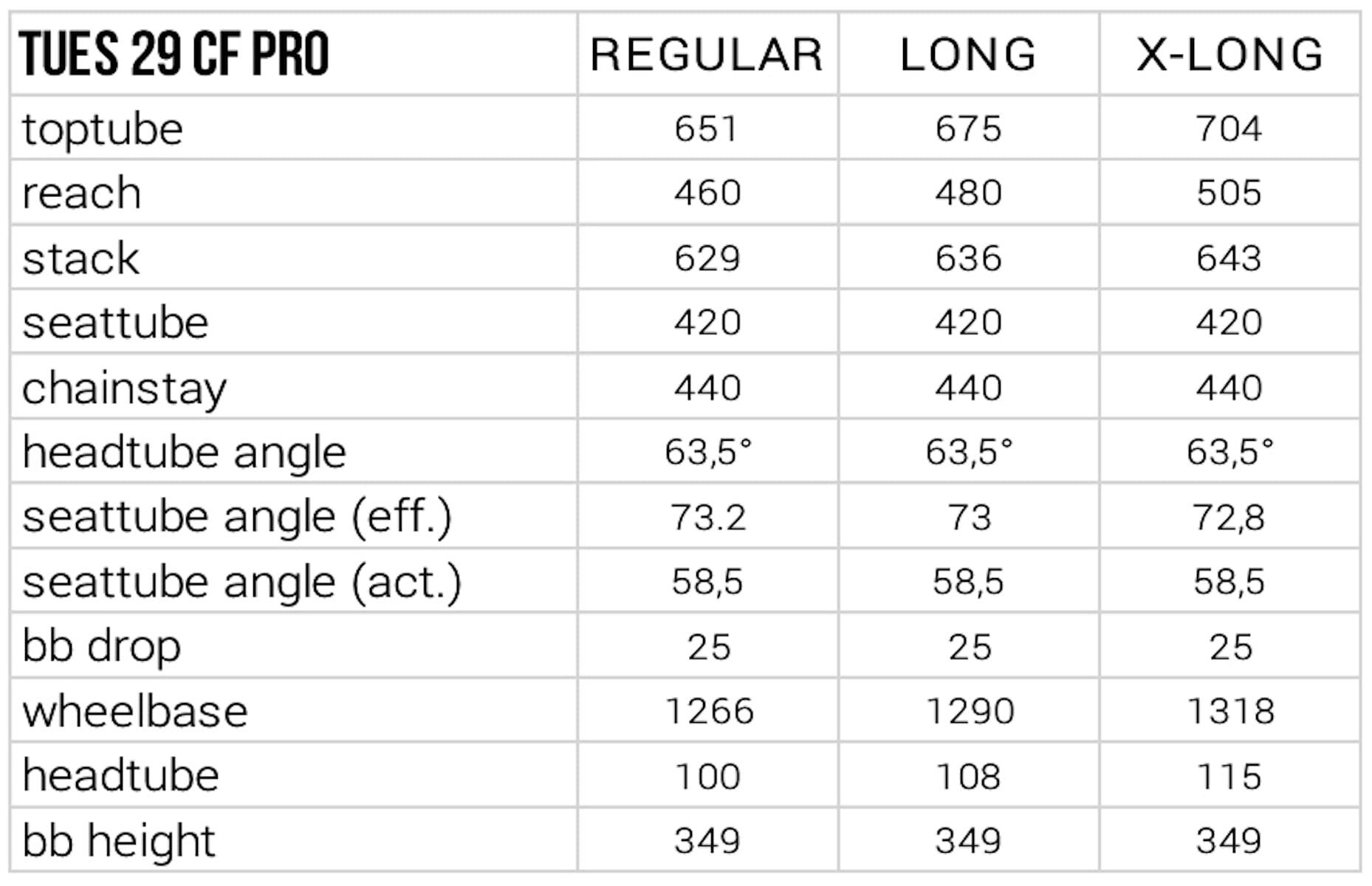 The 29er version of the Tues will be available in either Race or Pro Race builds, along with the standard 27.5in model. As far as we can tell, both the Race and Pro Race bikes get the same carbon fibre frame and geometry, with the differences being specification based.