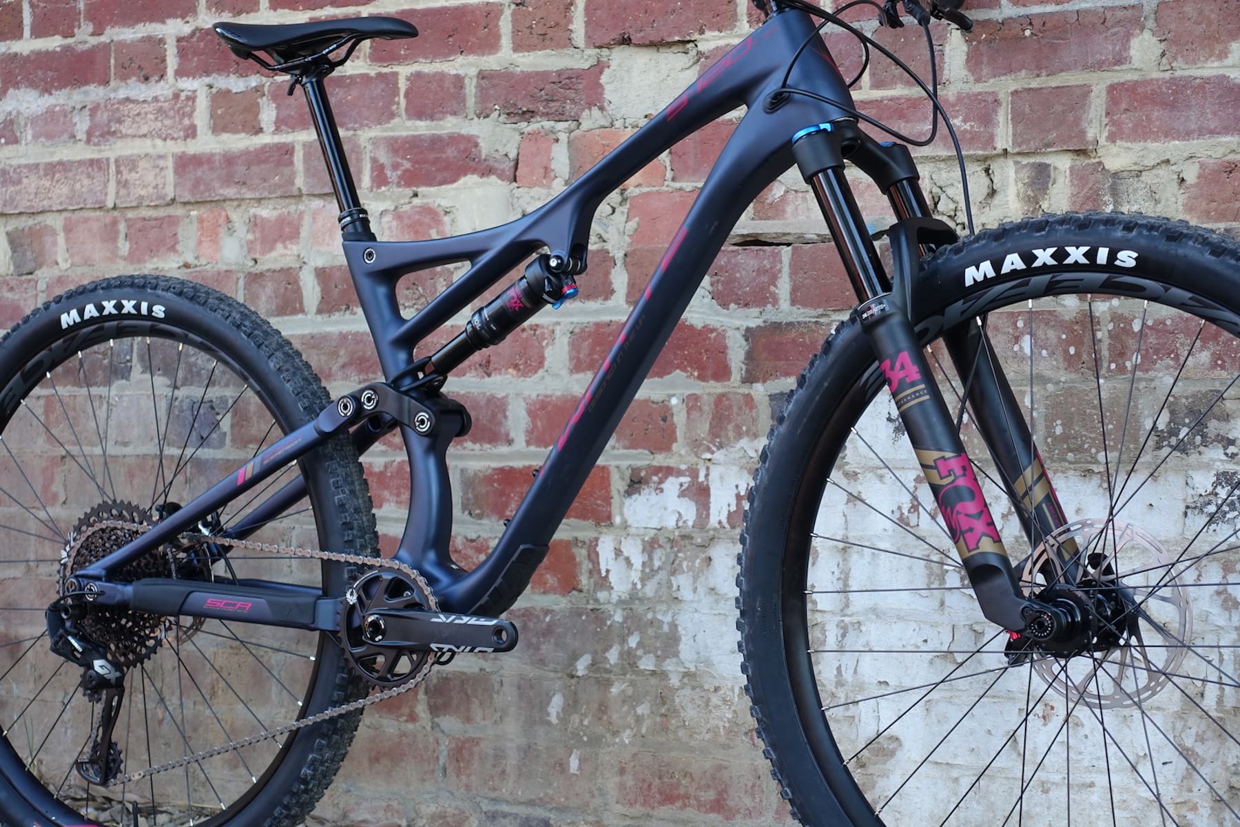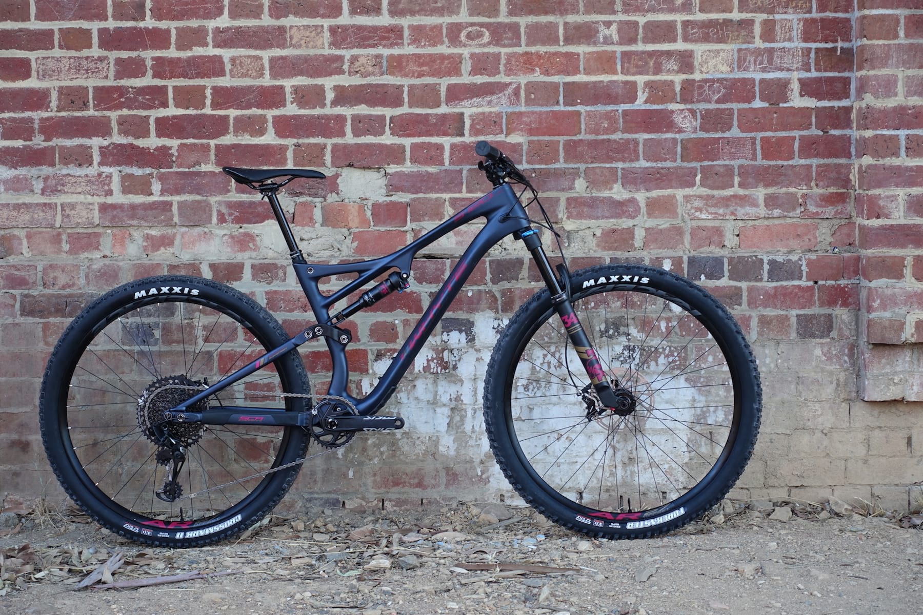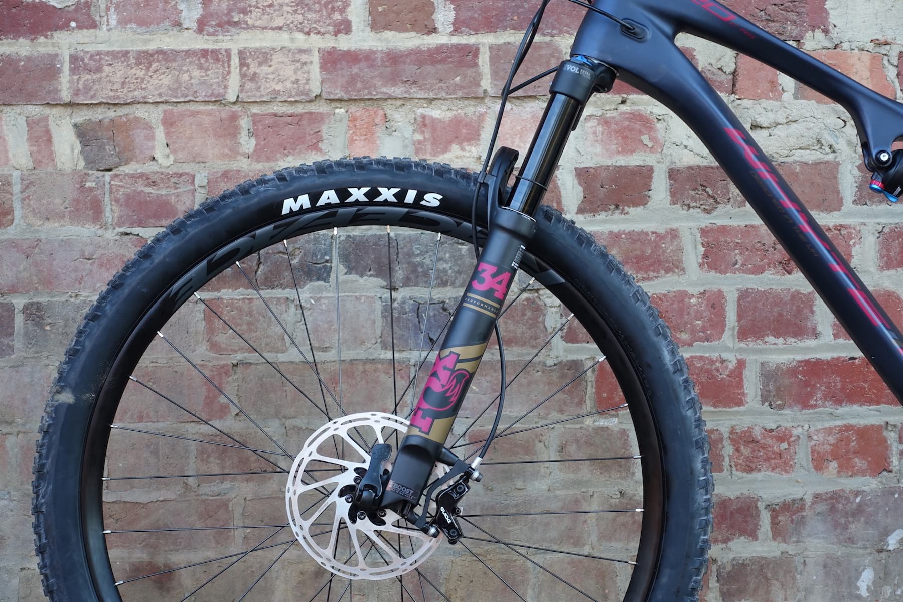 Then you see the suave carbon mainframe. And the lightweight Fox 34 Step-Cast fork. And the…err…’optimistic’ Maxxis Crossmark II rear tyre.