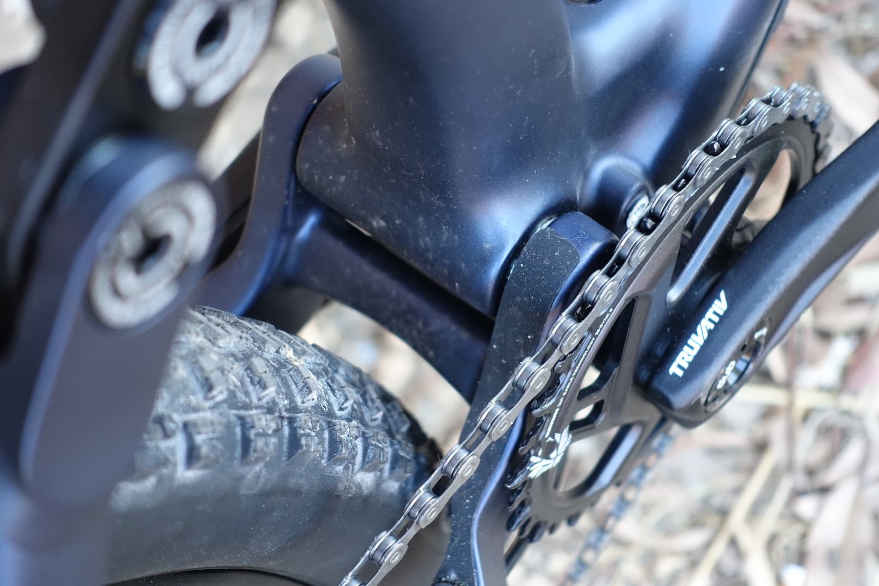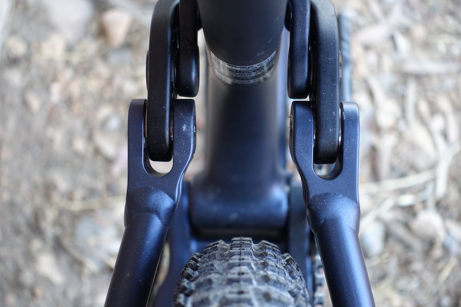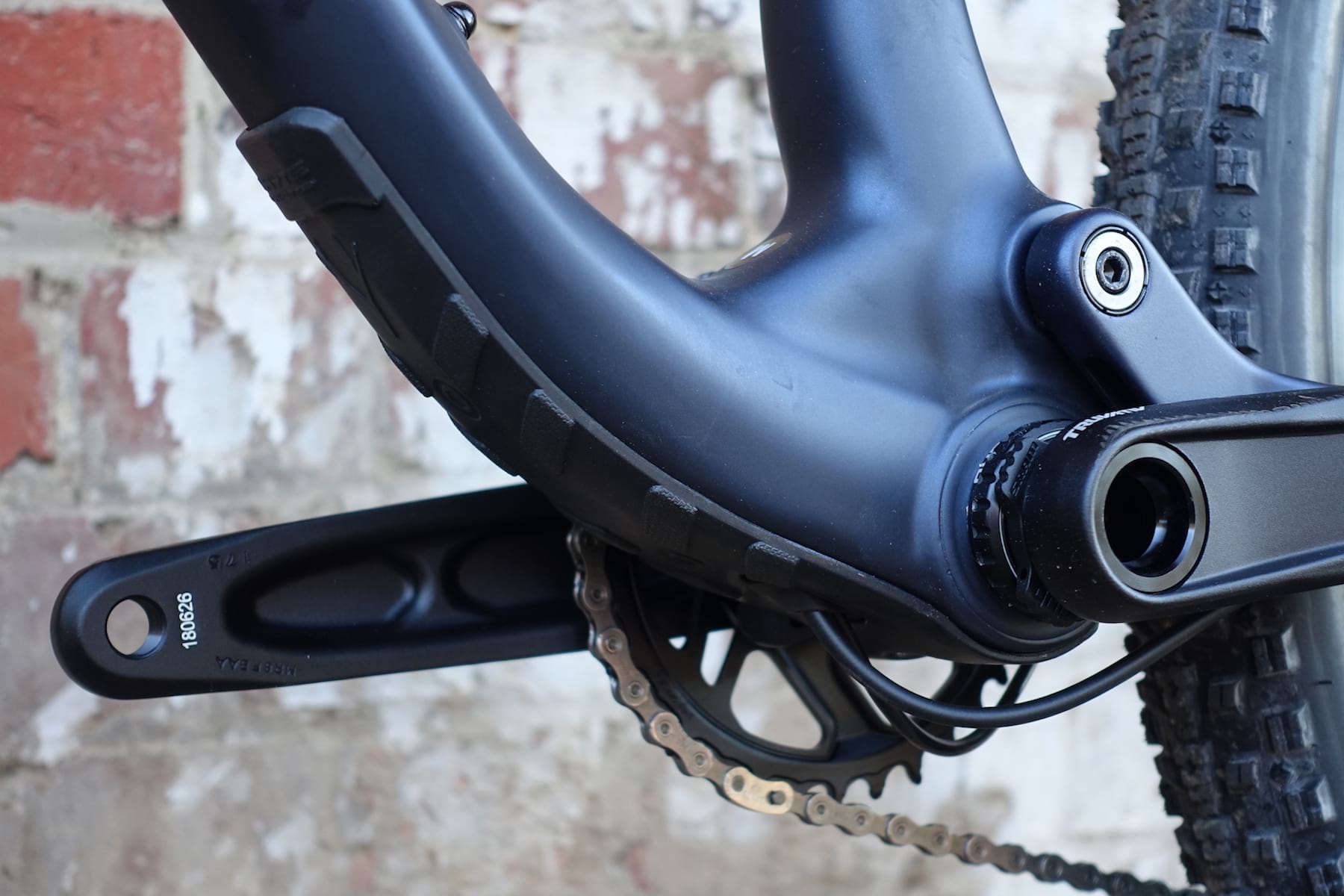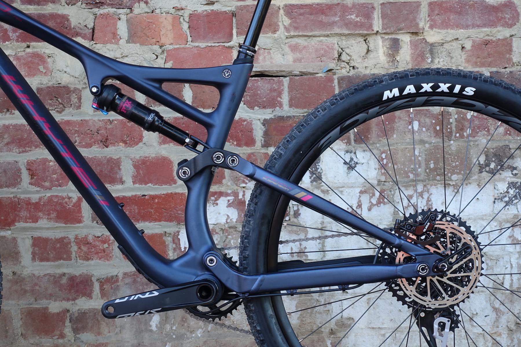 Then you see the suave carbon mainframe. And the lightweight Fox 34 Step-Cast fork. And the…err…’optimistic’ Maxxis Crossmark II rear tyre.