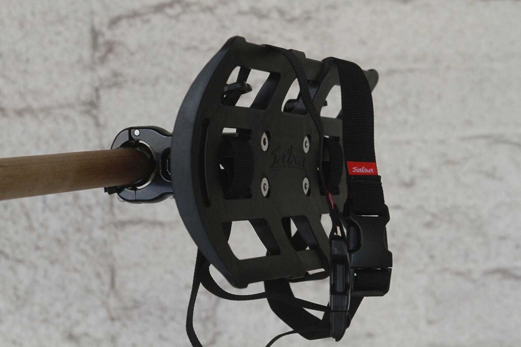 The Salsa Anything Cradle is designed to be a superior bikepacking solution to the dry bag and strap or handlebar rolls that folks have been using for years. The Anything Cradle holds your gear away from your bars using a couple of stand-off bar clamps. This creates room for cables and housing without fear of kinking, stressing, or otherwise damaging them. The cage is lightweight and tough nylon while the arms are forged aluminium. It’s compatible with 31.8mm bars and can hold up to 8lbs/3.7kg in weight. The straps are 25mm nylon webbing and can be deployed elsewhere on the bike too.