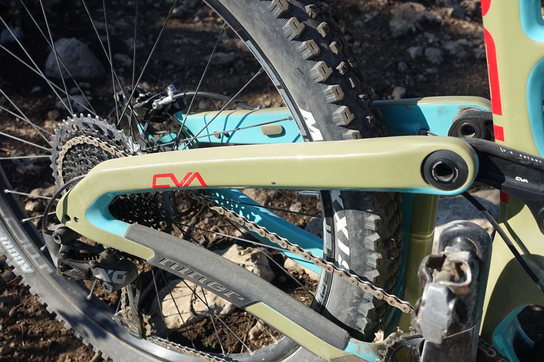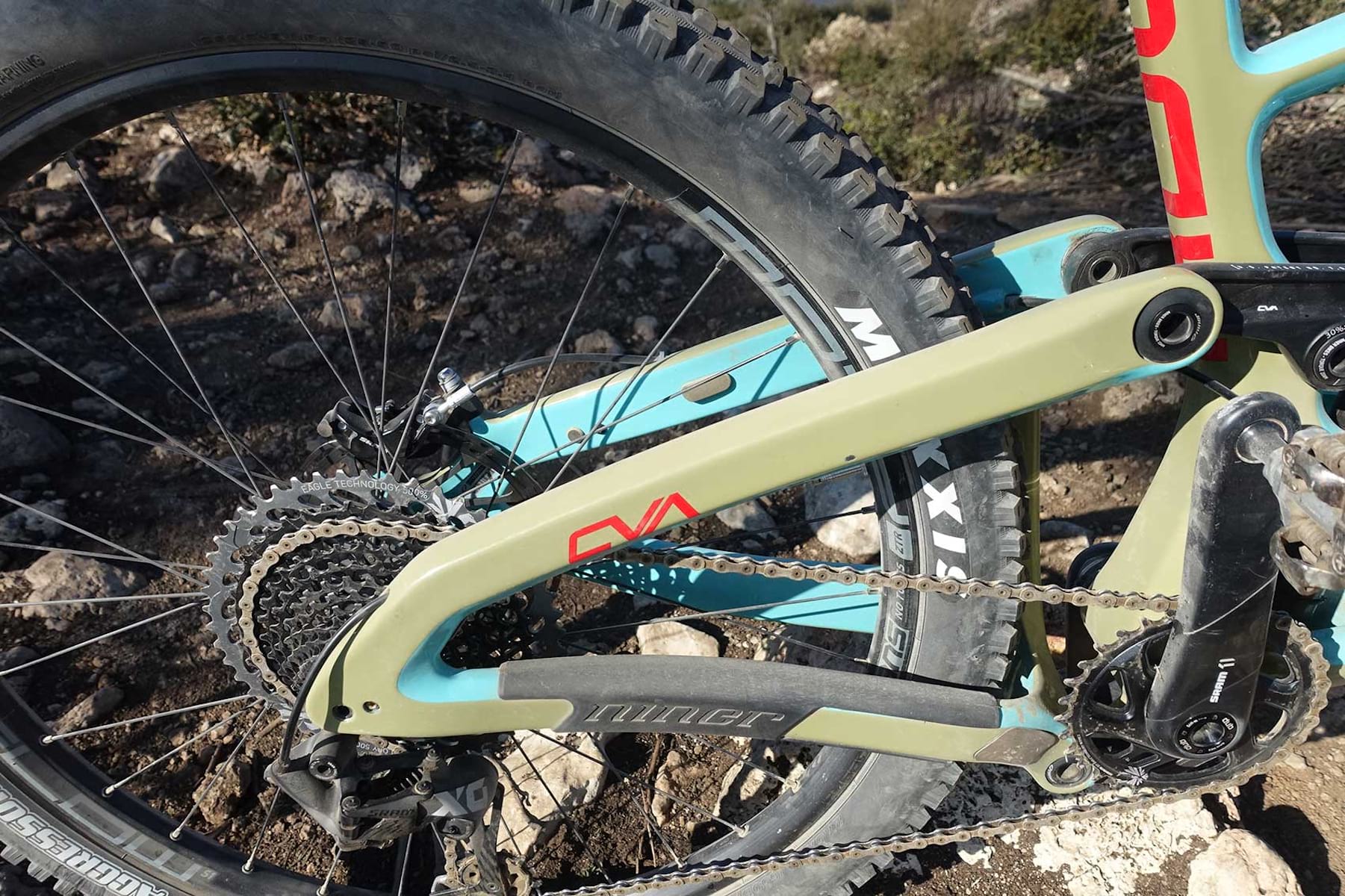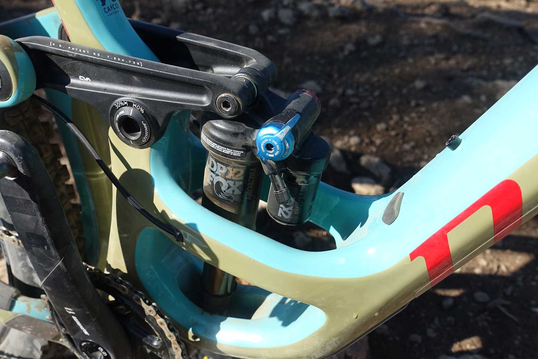 - All the suspension linkages have been tidied up, eliminating the bracing strut on the rocker, to allow for more tyre room, stiffening of pivots (which all run Enduro MAX bearings). There’s even a neat sag indicator built into the pivot cover.