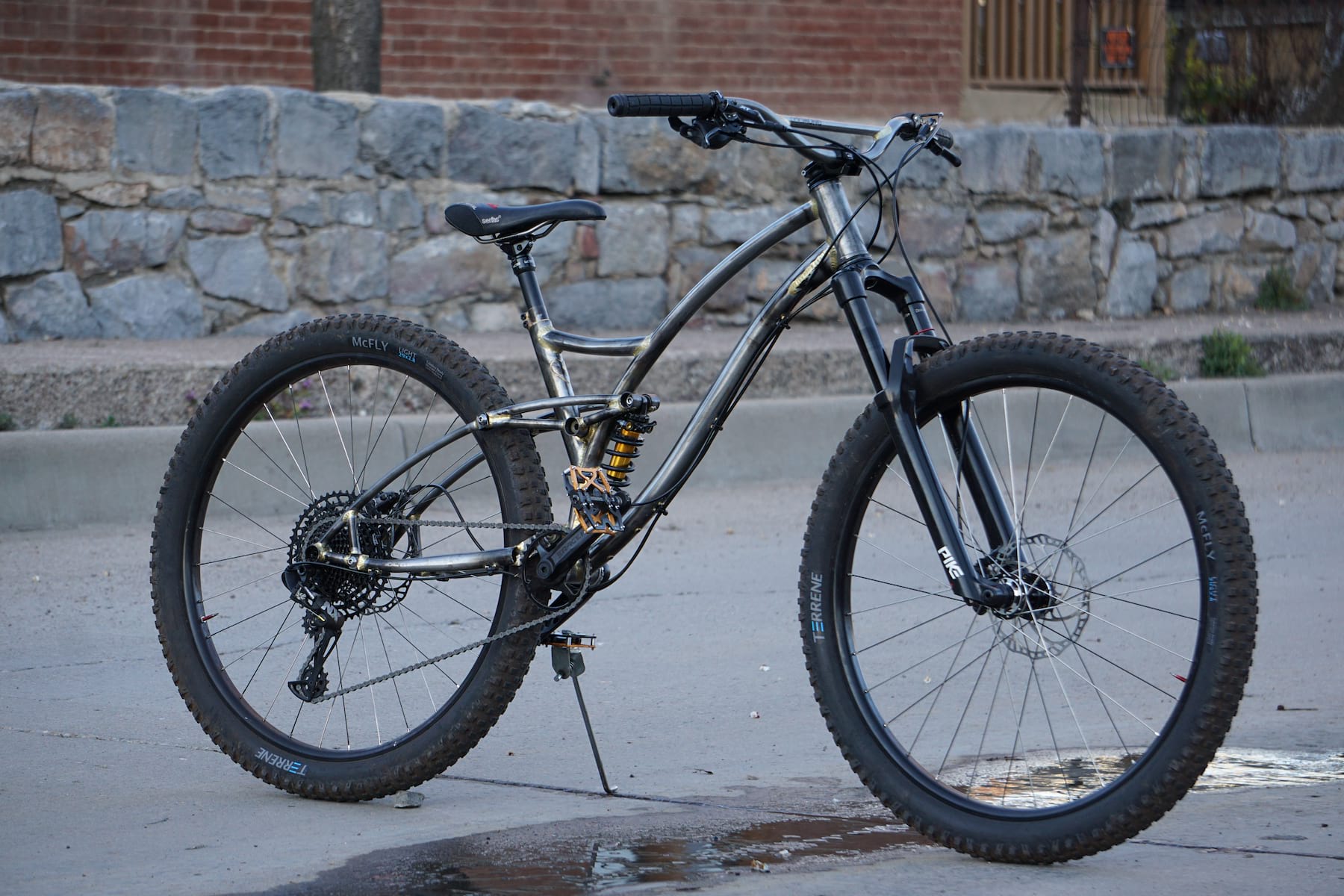 “Full Enjoy is a mid-travel, progressive geo, trail schralping destroyer. It takes some sauce from Evil, super slack (62°) yet shortish (140 or 150) travel, some magic from Transition who make bigger bikes that pedal and brake perfectly, some of the Yeti koolaid- responds to ollies with some progressive energy return, and some of that good good from MonÄ“ Bikes- reasonable top tubes lengths and super short (425mm) chainstays that allow the front end to effortlessly leave the ground. (Let’s party) It also “points and shoots”, is very laterally stiff and vertical compliance is super good.”