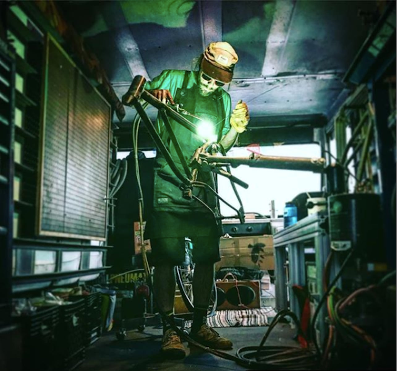 Thank you so much for making that distinction. I was feeling a little offended after question 1. I started out building bikes in a pool maintenance room and quickly realized I need a space of my own. Living in a ski town at the time, I needed to get creative. Creative in this case meant a tiny 1977 Toyota Chinook RV. Think small, and then half that. Custom buildout with cabinets, workbenches, a tiny lathe, and little baby files. Building a tandem in there was my crowning achievement. Then, one day, I grew up, bought an old Wonderbread delivery truck and started a new. It’s got a little four cylinder diesel so it gets decent mileage but it’s slow and rides like a Snap-on tool box. About three times as big as the Toyota, I barely know what to do with all that space, so I put in a queen size bed.