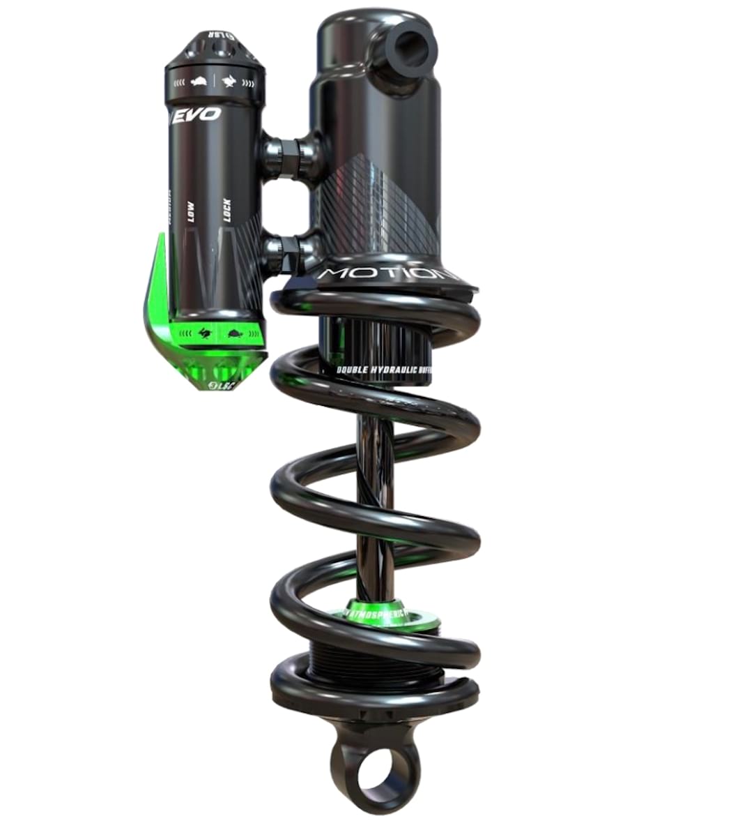 French brand Motion Ride has announced a new rear shock that they plan to unveil at the Taipei Bike Show. Unlike their unique looking linkage fork, the Flow Evo rear shock uses a more traditional looking design with a coil spring. A piggyback separates the oil from the main body of the shock and offers low-speed rebound and low-speed compression settings. The big claim here is that Motion Ride says that the shock can never be bottomed out.