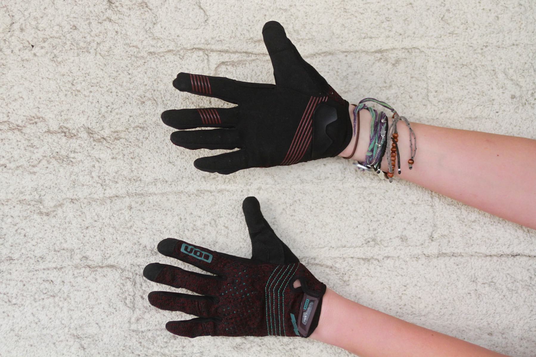 The ION Seek women’s gloves are a breathable knitted fabric on top with knuckle protection padding. The palms have a rubbery patch just where your grips will be, meaning you can have a really tight hold of the bars as you clip a tree and don’t feel it. (Please don’t try that.)