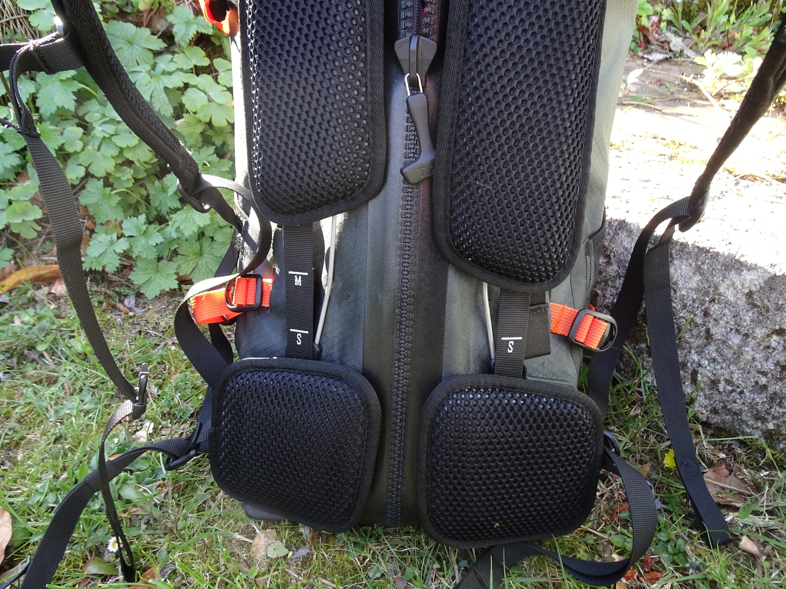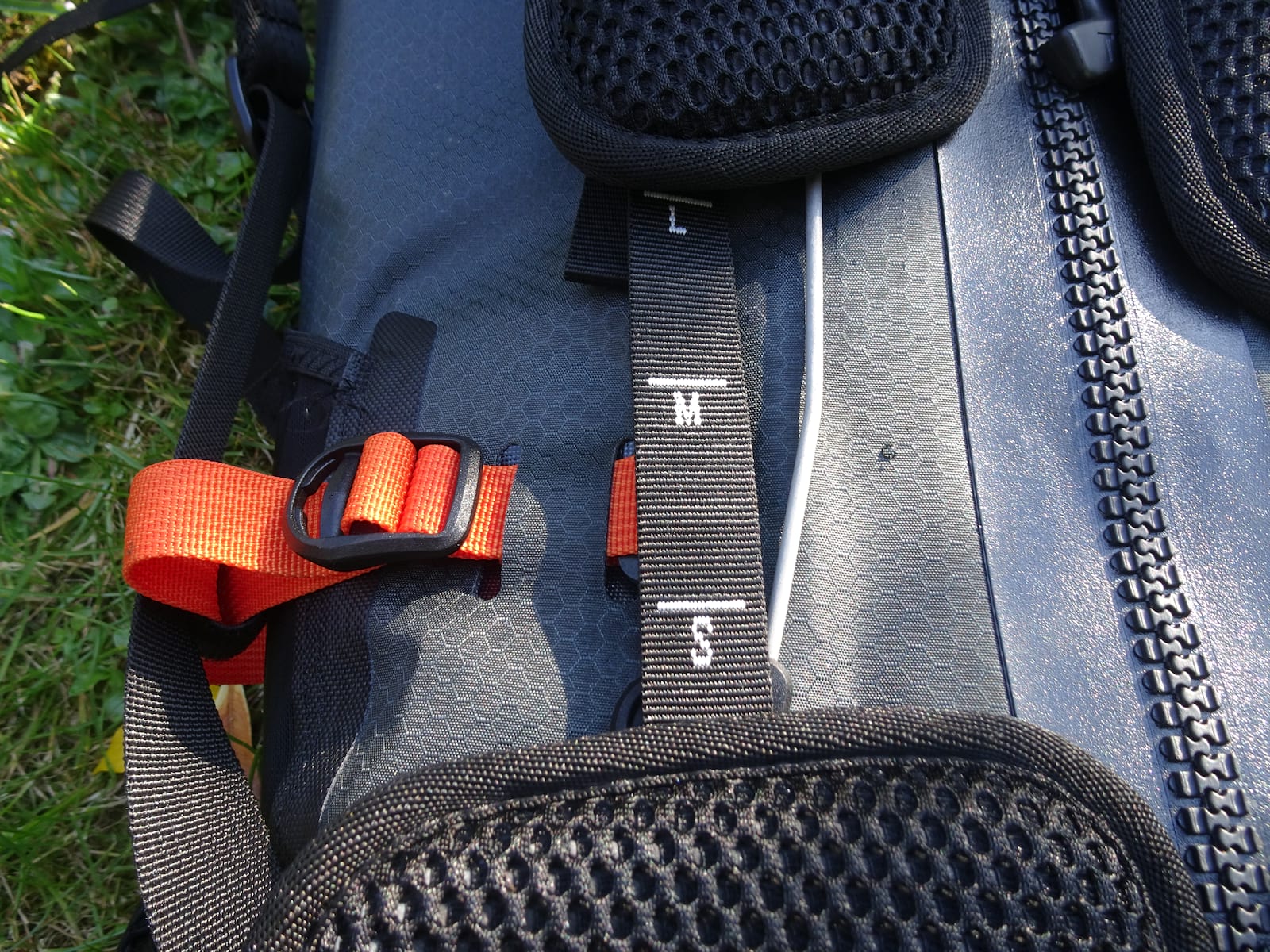 Adjustment is really clever – the back pads slide up and down on independent rails, with markers for small, medium and large on the straps that tie the pads in place. It’s worth experimenting with these as I found that the pack could either tap on the back of my helmet (annoying) or snag on it (really annoying). It’s a big pack designed for carrying a lot of stuff but I found the perfect fit after a couple of goes.