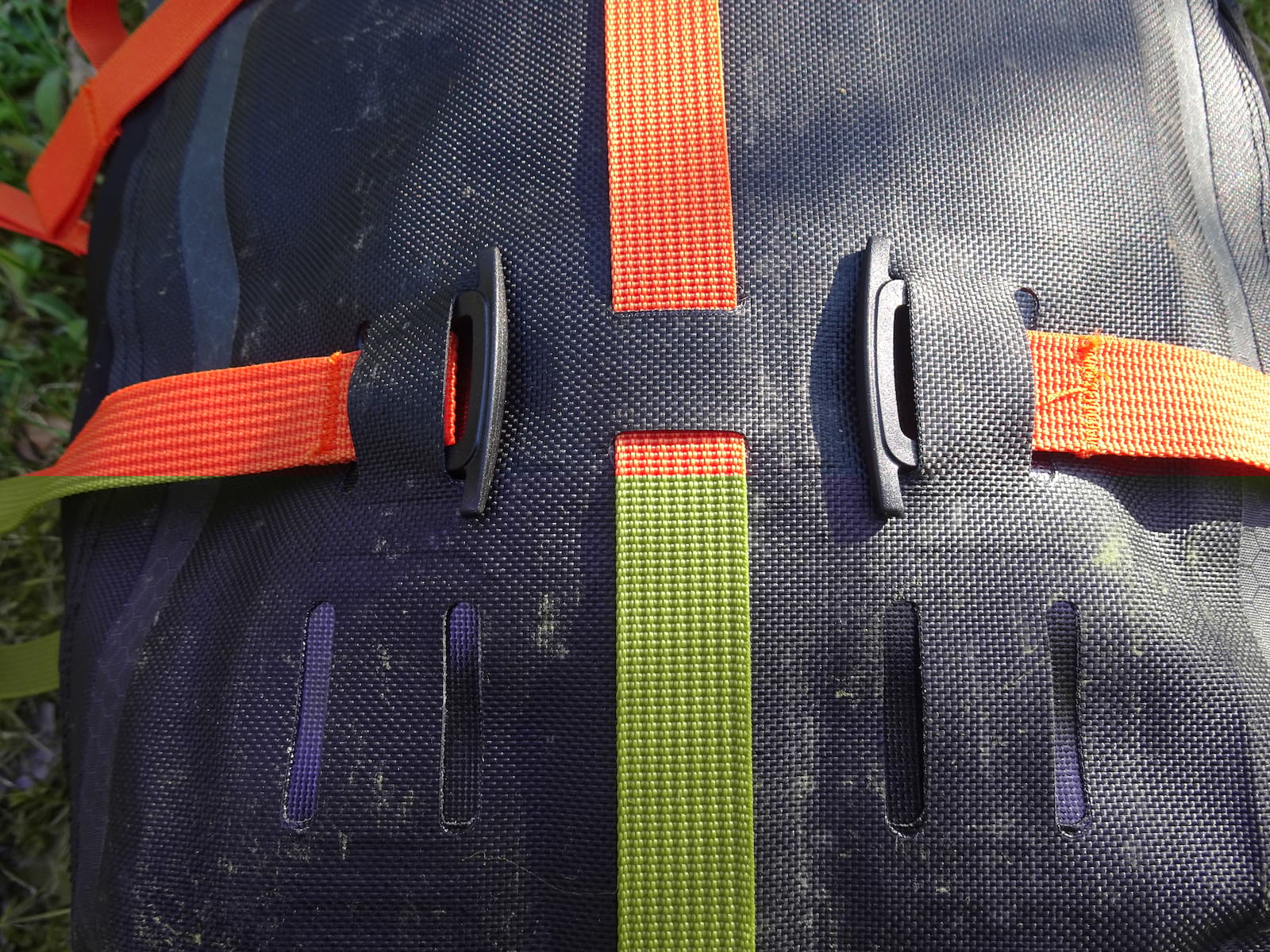 The bonded material of the Atrack is ‘high frequency welded’ which means it there are no stitches or glue that might give way and eventually let moisture get in. The outer ‘skin’ of the pack has various slots into which the nylon straps are threaded, held in place with hard plastic toggles and pull-tight buckles.