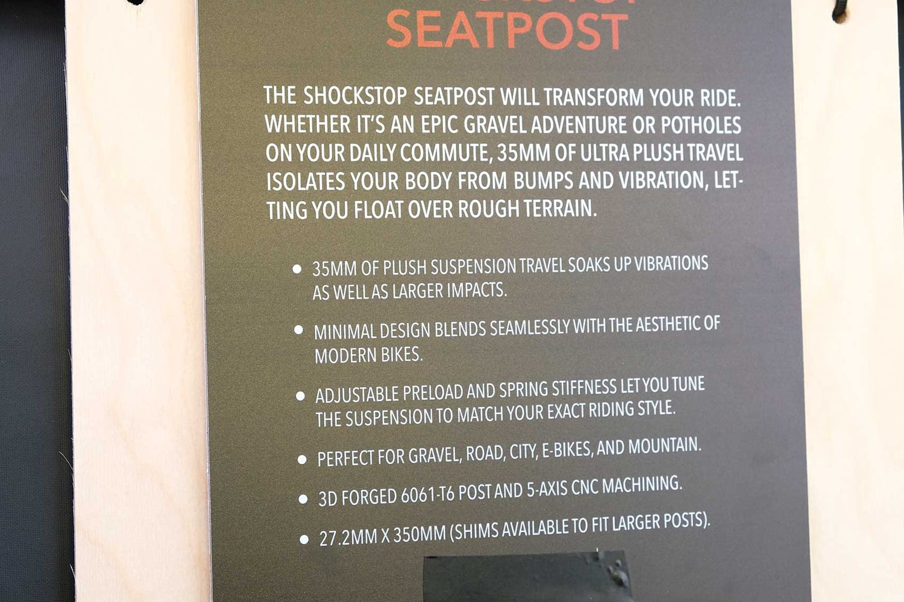 Some riders, especially long distance racers, gravel riders and even tandem stokers like a bit of a suspension seatpost. Redshift makes one of those right now, which gives 35mm of parallelogram travel with a steel spring. (Apparently steel gives a smoother ride than elastomers in this situation, it uses elastomers for its suspension stem…)