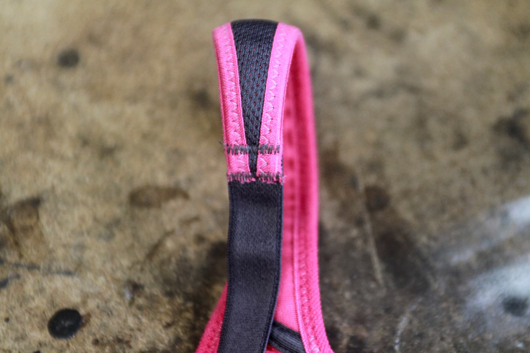 The bra cups are made of two layers of fabric: one solid pink which has almost no stretch to it, and an outer mesh layer which also does not stretch. The straps are wide over the tops of the shoulders and slightly padded, and taper into where they join the bra at the front, and into the wide elastic at the back.