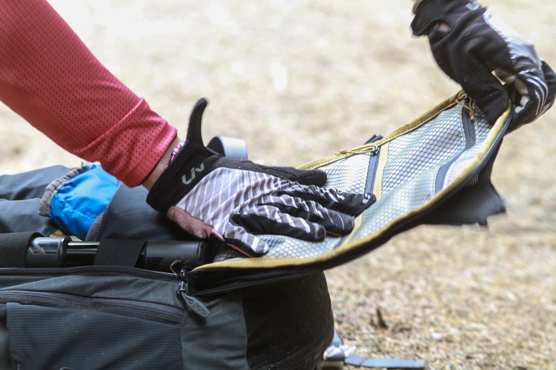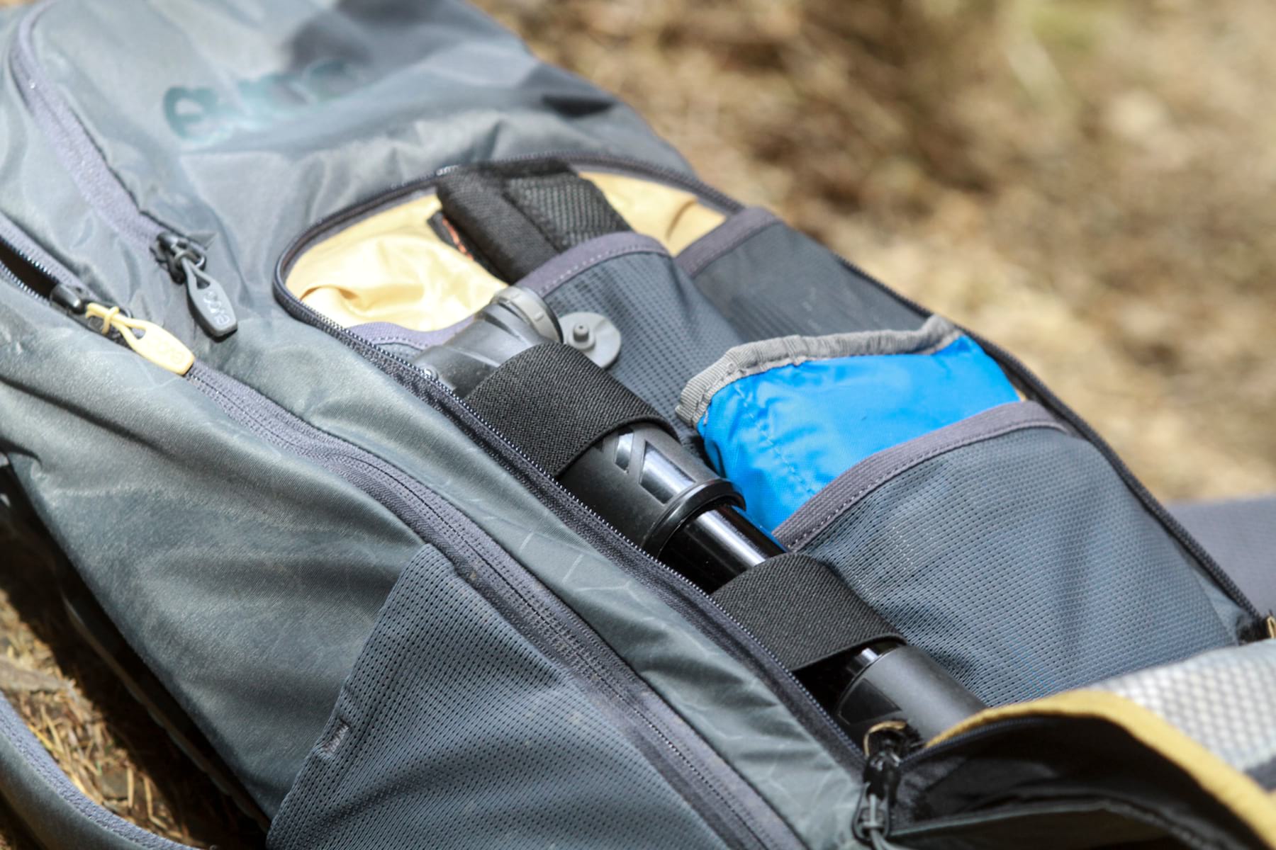 Behind the front helmet stow area, there’s another pocket that opens out completely to reveal two opaque family flat plastic zipped pouches – handy for first aid materials – and a series of stretchy pockets, including two elasticated loops for holding a pump. There’s plenty of room here for all the tools you could need, plus maybe a snack bar or two.
