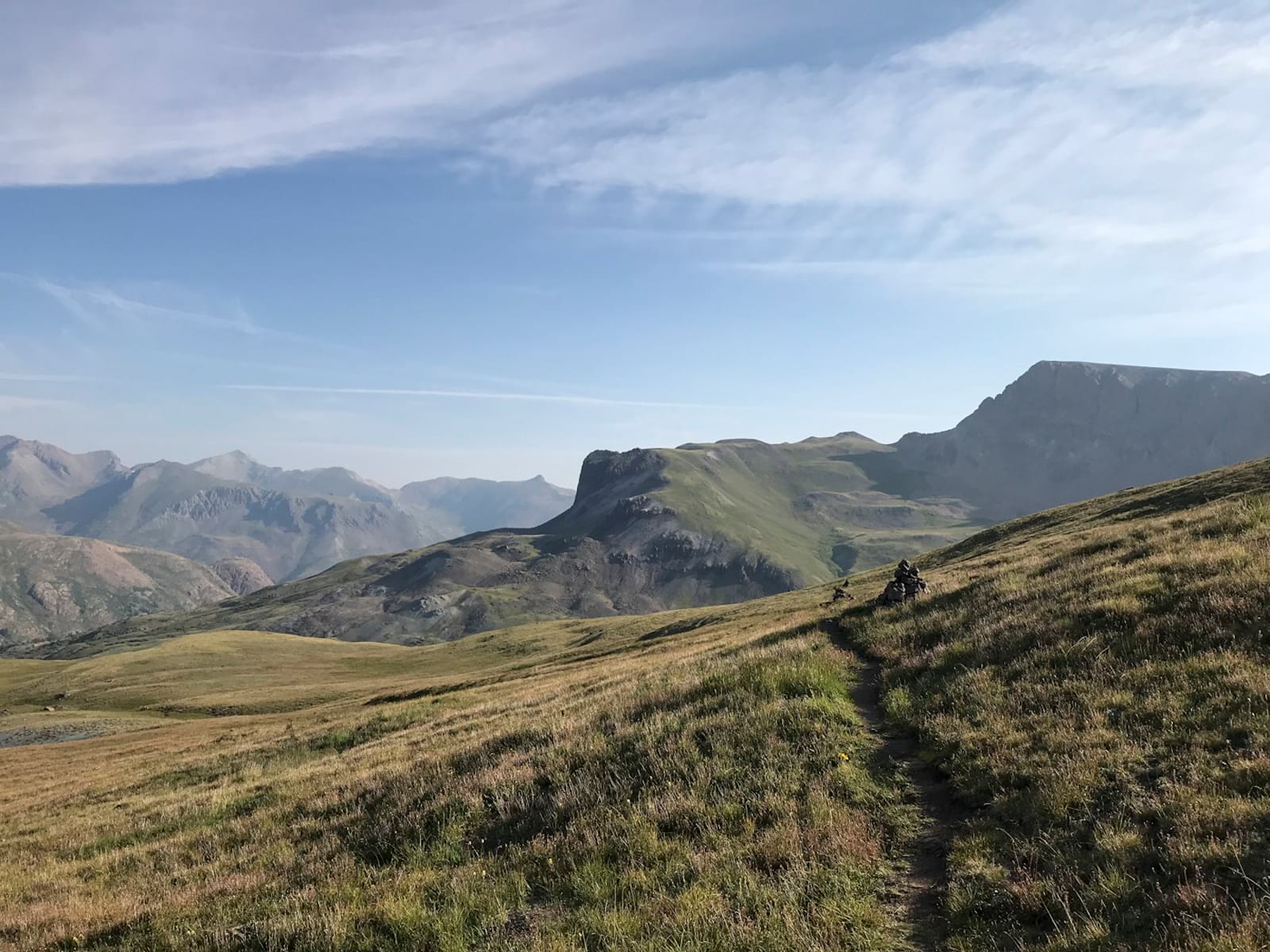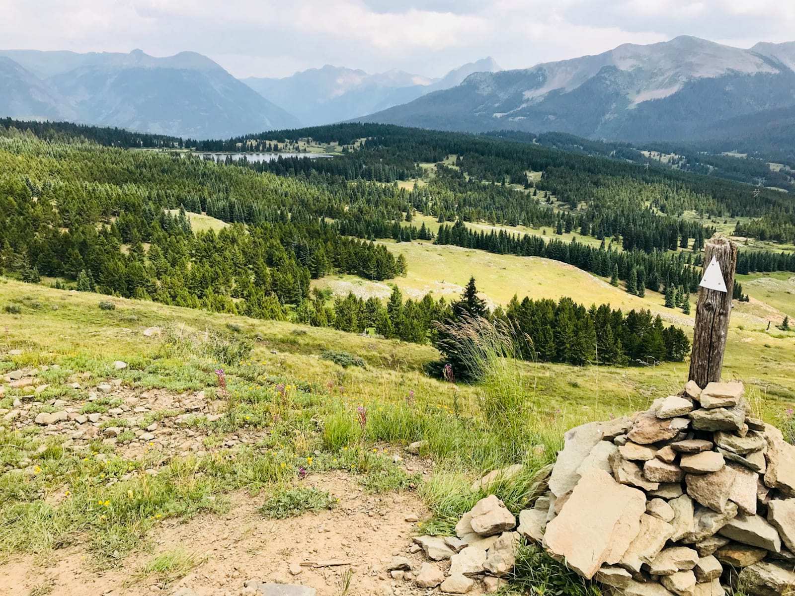Then I lifted my head. The Great Divide Trail merged here with the Colorado Trail. An iconic spot. The cool and still late afternoon air was soft and incredibly peaceful as I gazed out across layers of high ridges and peaks. Lungs vaguely replenished with oxygen, I followed a further section of flowing singletrack to a grassy plateau and couldn’t resist sitting down to properly enjoy the tranquillity. It was bloody hard to get here, but bloody worth it.
