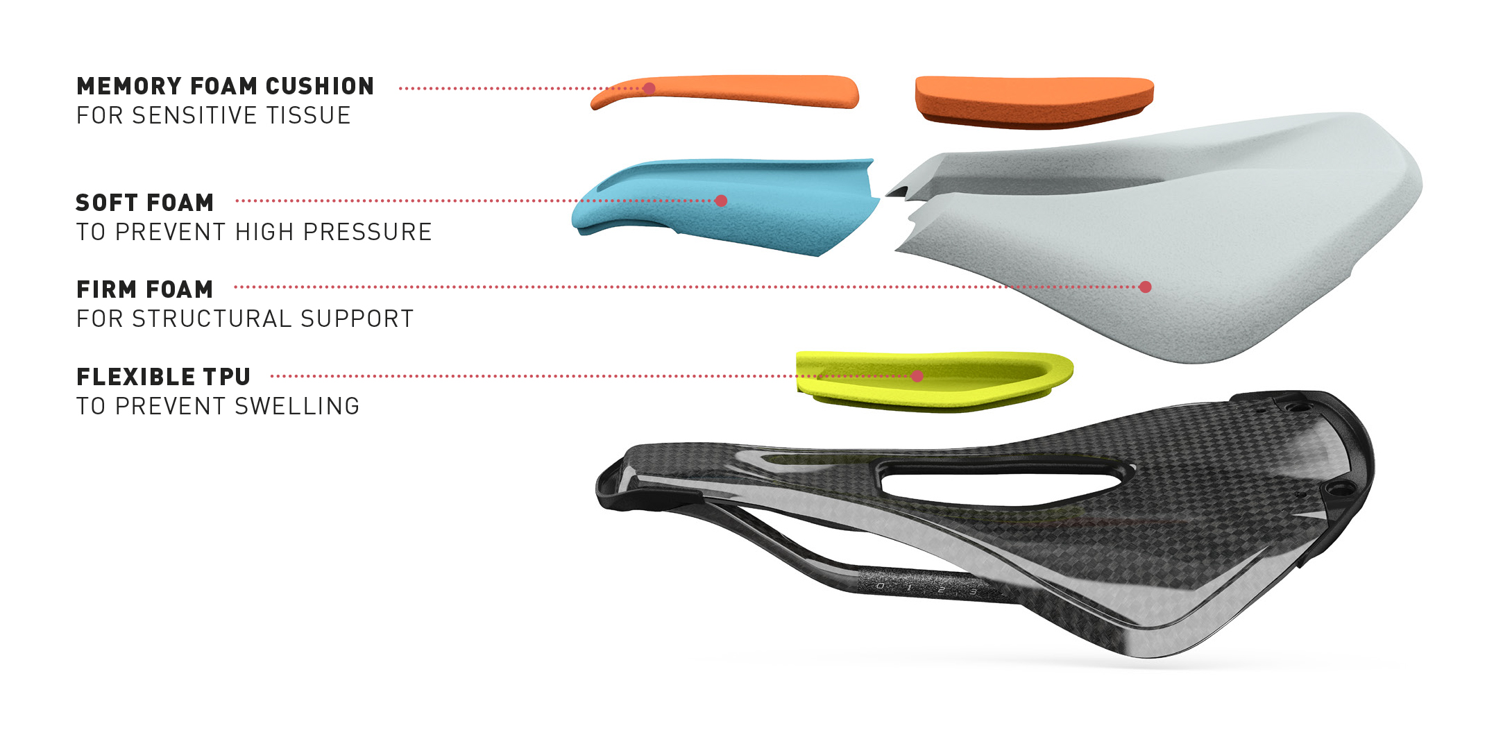 So what is MIMIC? This is the technology Specialized claims can reduce pressure on sensitive areas whilst providing the structural support needed for blood flow. This is achieved with a multi-layer design of different foams. The main shell features a cut-out that is filled with flexible, concave thermoplastic polyurethane (TPU) to prevent swelling. That’s roughly where your flower will be. The bulk of the main layer is firm foam on the largest portion of the saddle, which provides an actual seat with the structural integrity needed to hold a person. The front of the main layer is a softer foam to prevent putting too much pressure on you. To finish, a small layer of memory foam creates a cushion for sensitive tissue.