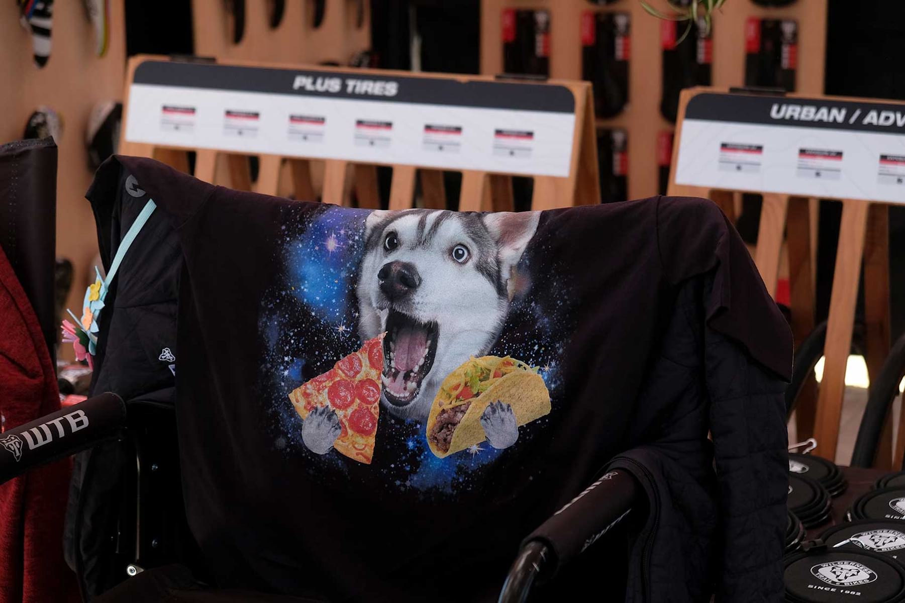 And finally, we saw this T-shirt on the WTB booth – possibly the best T-shirt ever. A wolf AND pizza AND a taco?