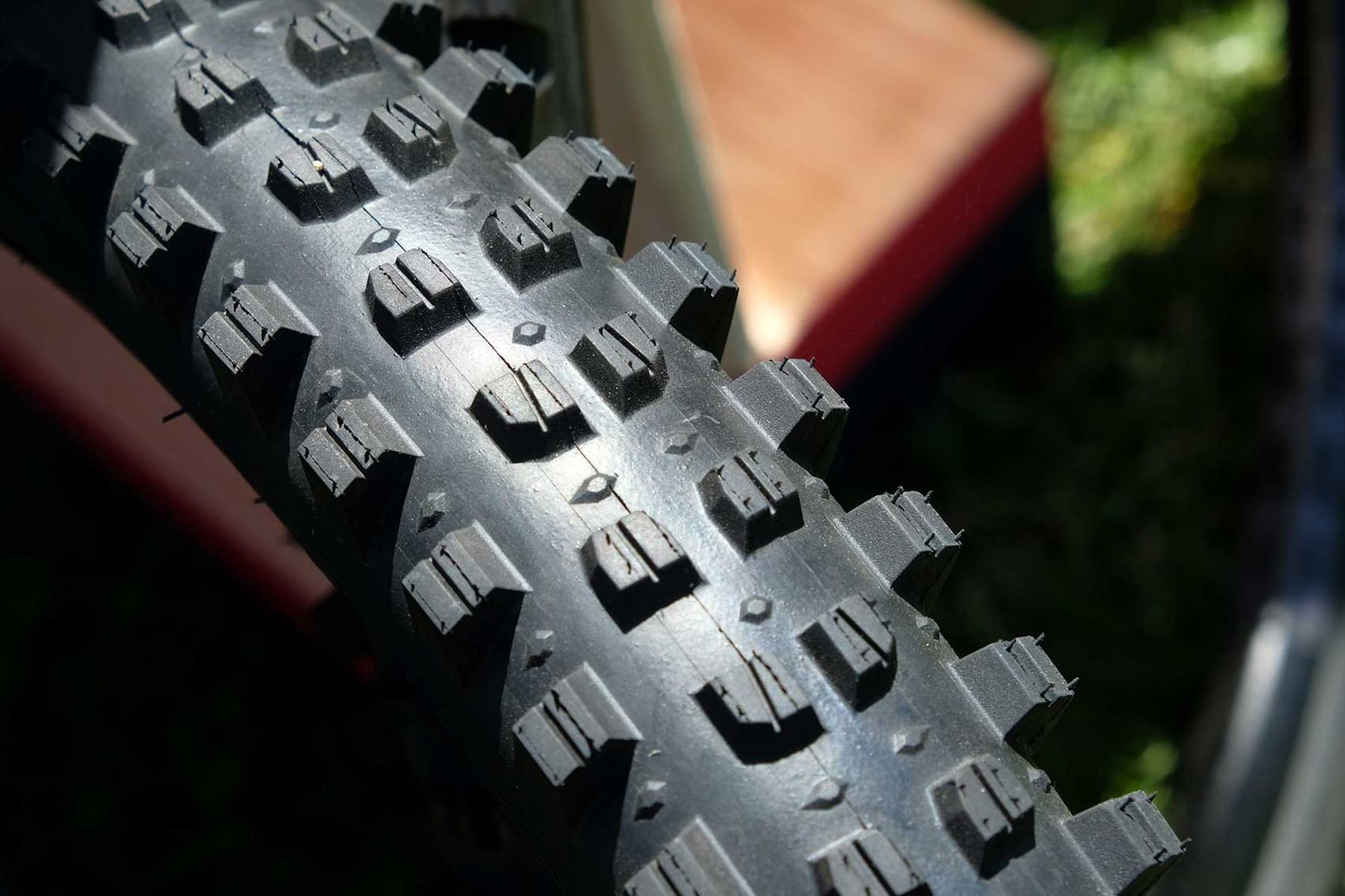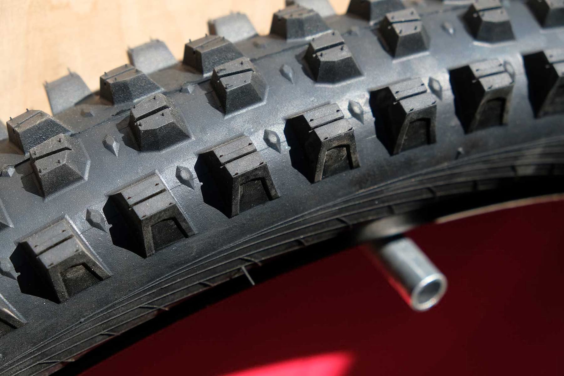 The tops of the centre knobs consist of a medium durometer compound to provide traction and durability without sacrificing rolling efficiency, while the outer knobs feature the softest compound to deliver maximum grip and slow rebound.