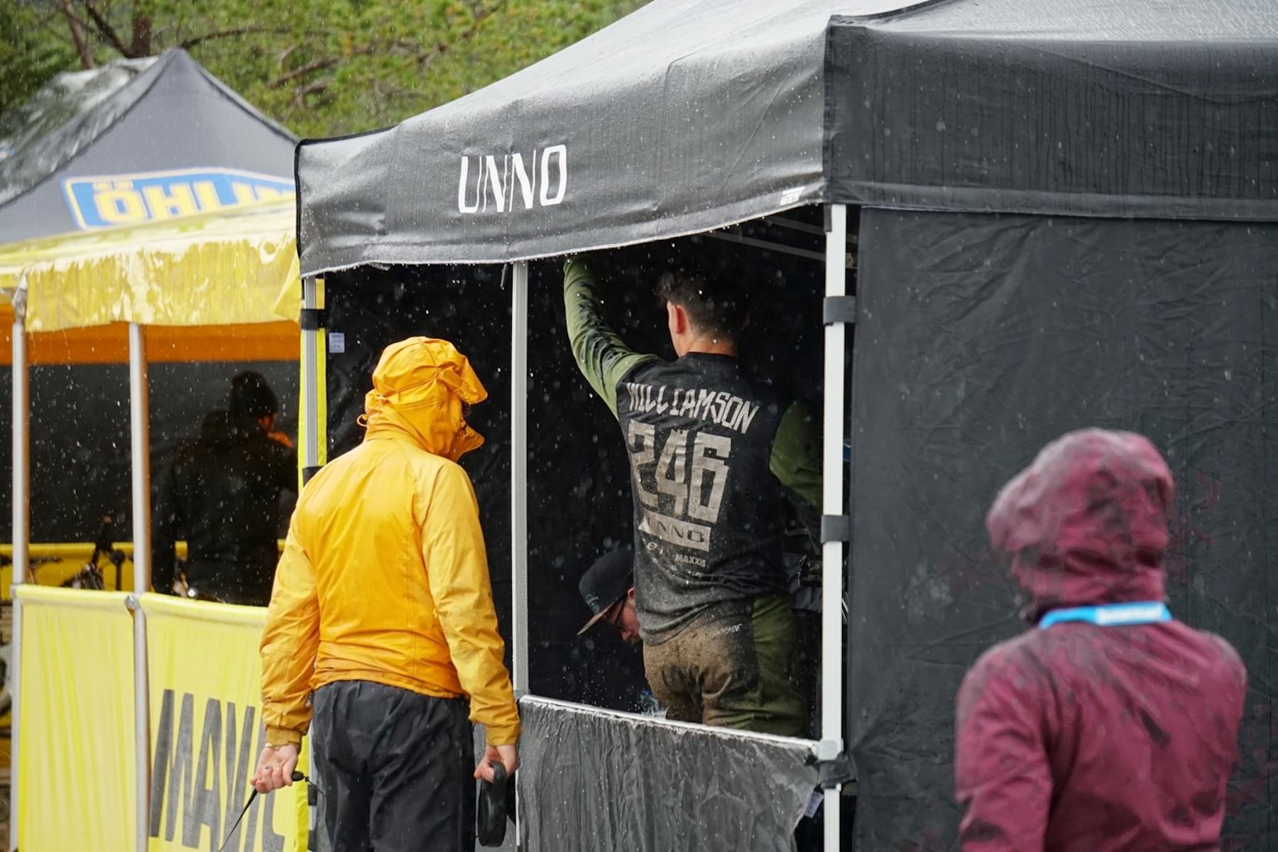Jack Moir’s puddle laundromat George Brannigan resorts to pressure washing his shoes after practice. Finn Iles drying his gloves with a heat gun after practice. Our very own James Luv attempts to drink all the rain. It’s a valiant attempt but it continues to rain. Muc Off’s nanotechnology works overtime to keep the rain off. Loris Vergier and Luca Shaw look thrilled for the ride up in the rain. Waste not want not. When not fixing and preparing bikes, mechanics build ingenious drainage solutions. Some riders decided to simply stay out of the rain. What would happen if this bike actually touched mud? Tracey Hannah splish, splash and splashes down Fort Bill. The happiest gentleman in Scotland this week.