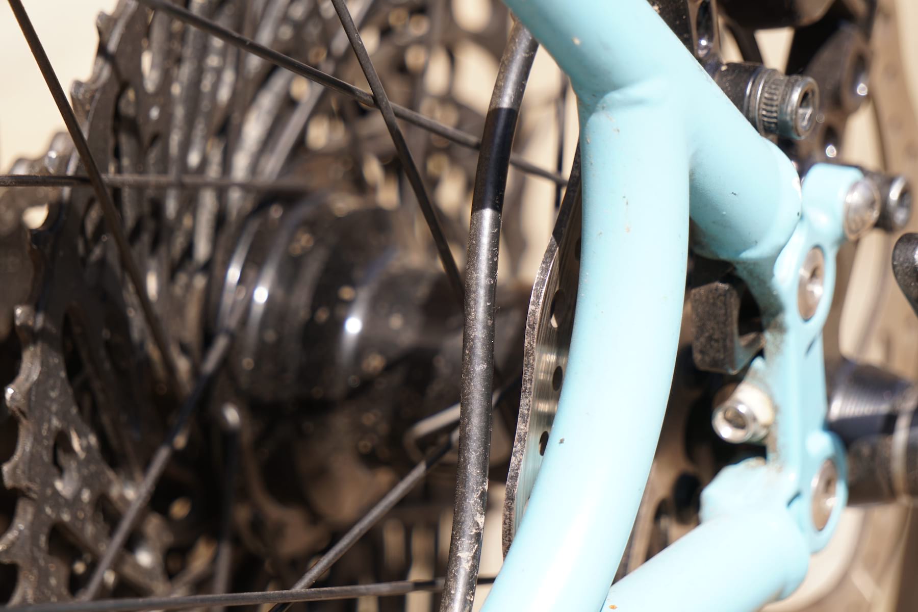 Our test bike was 8 months old and was beginning to show a few marks in the paint here and there. There were rub marks in the finish from cable and hose routing, and a scratch in one of the seat stays. That’s not a dreadful amount of damage for a demo bike, but personally, I’d want to put some budget aside to get the frame Invisiframed or similar. A protective finish would also help to keep those decals on too, a few on our bike were starting to peel off.