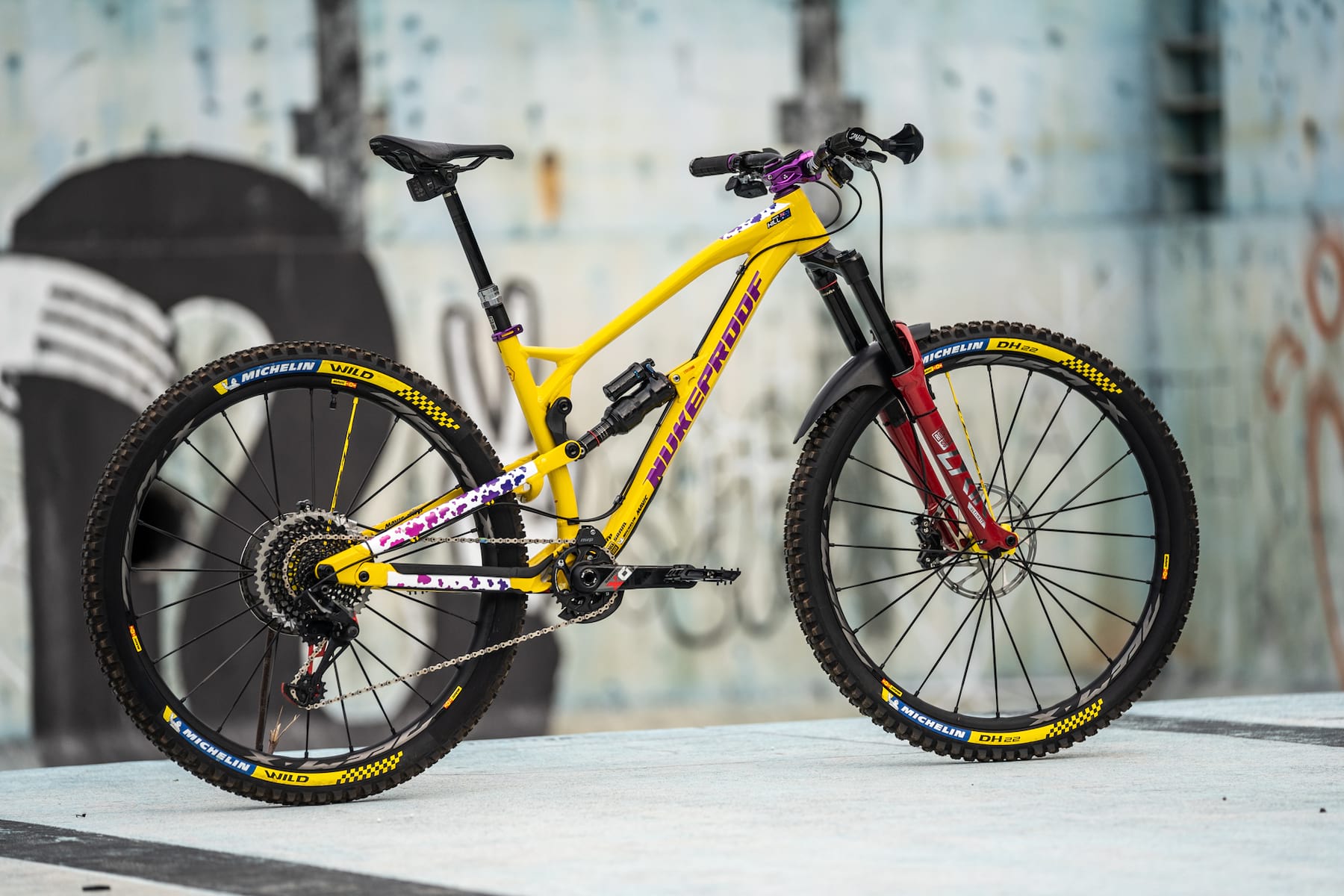 Sam Hill will be racing a 29er for the first time. The bike shown is an alloy Nukeproof Mega and features the new Nukeproof Horizon components in purple.