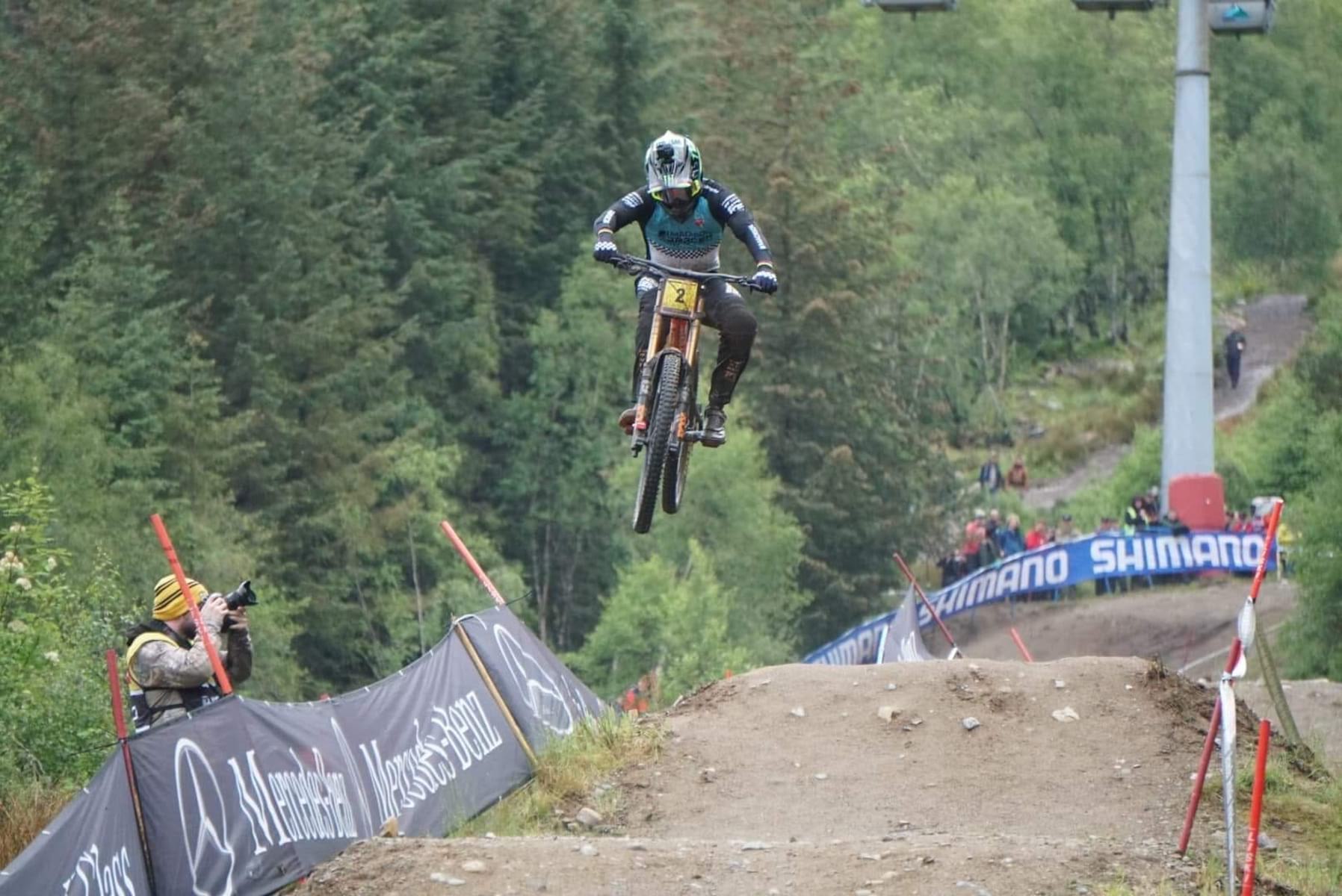 Local lad, and fourth place finisher from last year, Reece Wilson, suffered some bad luck reminiscent of Rachel Atherton’s race run from last year, busting his chain shortly out of the start gate. An unfortunate front wheel jam in the woods then spat him off the bike, sending him straight into a tree. He jumped straight back on the bike, and still managed to finish despite being chain-less and somewhat banged up from his crash.