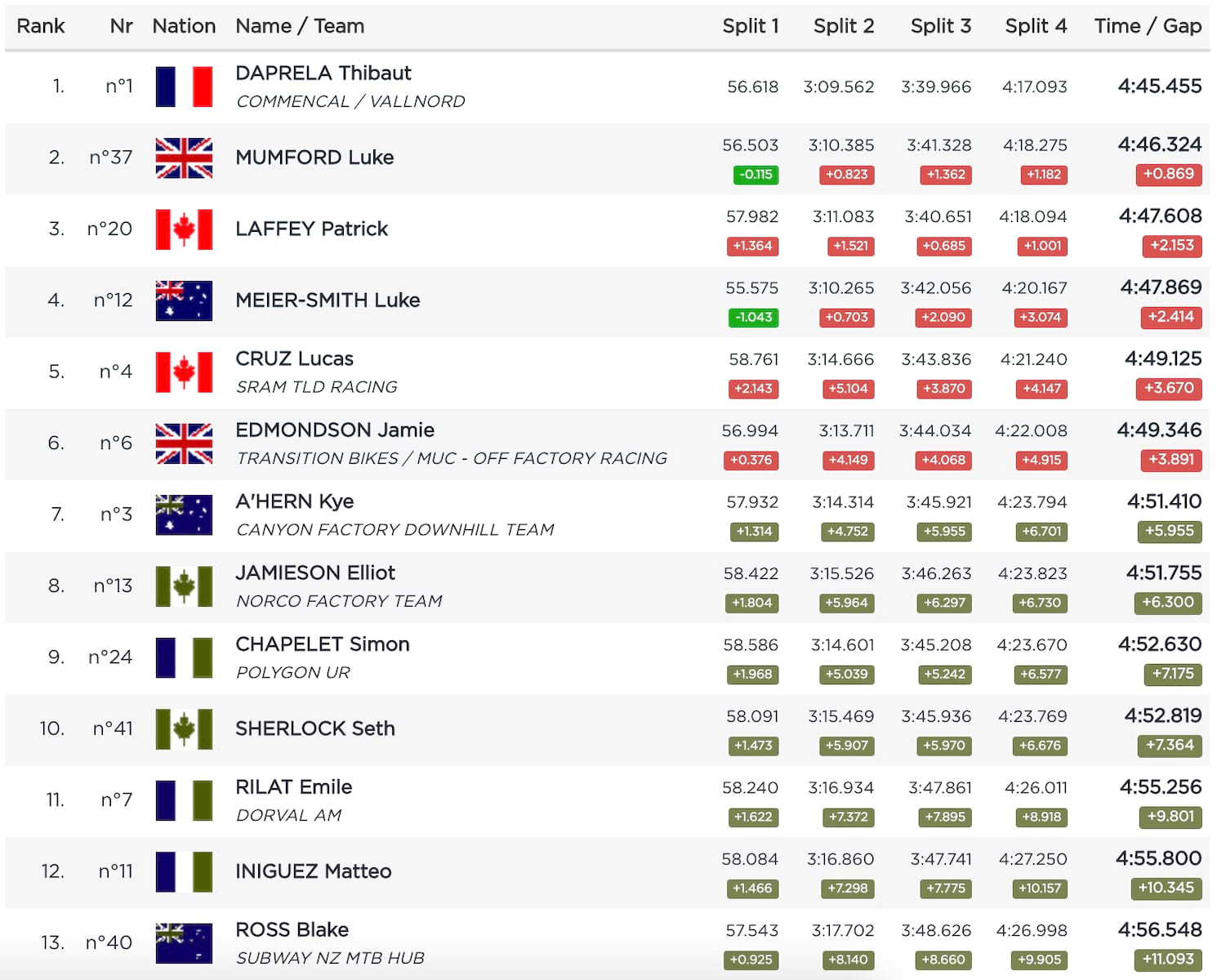 The Aussies followed, but like many others, Luke Meier-Smith lost time in the middle of the race track to slot into third, while Kye A’Hern finished with 4:51 on the clock. There were high hopes for Canadian Ethan Shandro, but a heavy crash in the woods lost him a lot of time, and he finished well outside of the top-10. That left the fast Frenchman, Thibaut Daprela as the last rider to come down the mountain, and an otherwise flawless run saw him put in five seconds over his qualifying time from the day before, taking the victory over Mumford.