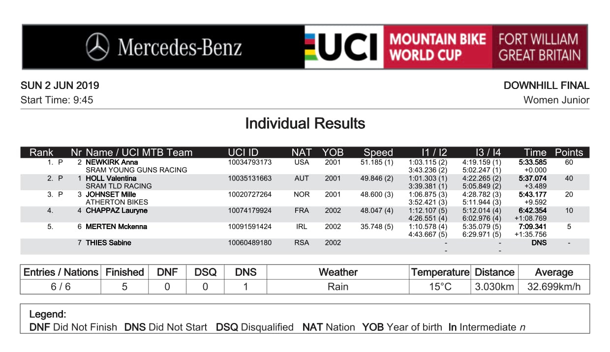 In fact all the racers were either as fast or faster than their qualifying runs, with Norwegian Mille Johnset from the Atherton Bikes team coming in third, France’s Lauryne Chappaz in fourth, and Irish lass McKenna Merten in fifth. Sabine Thies was a DNS. The average speed? Over 32km/h for the 3km race course.