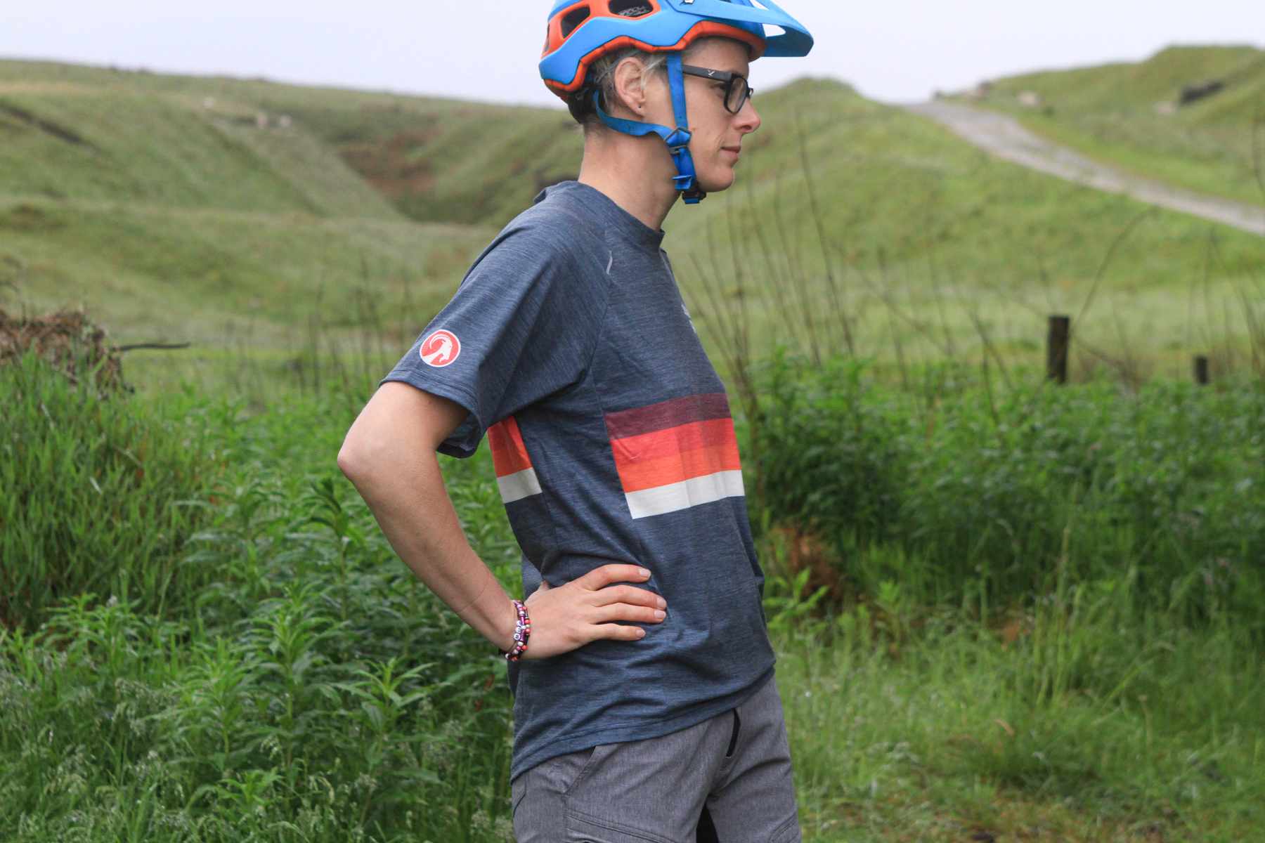 This is the jersey to go with the gravel shorts – unisex, and available in this kinda faded blue or a nice plum colour. Made with 41% merino wool, it looks like a much loved t-shirt that’s been out in the Californian sun, but feels like a proper soft and light technical t-shirt, complete with reflective shoulder tabs front and rear, plus a dropped back for bum coverage. No pockets though, to keep it floaty and comfortable. This is the small jersey, there’s an XS too, if you’re littler than Hannah.