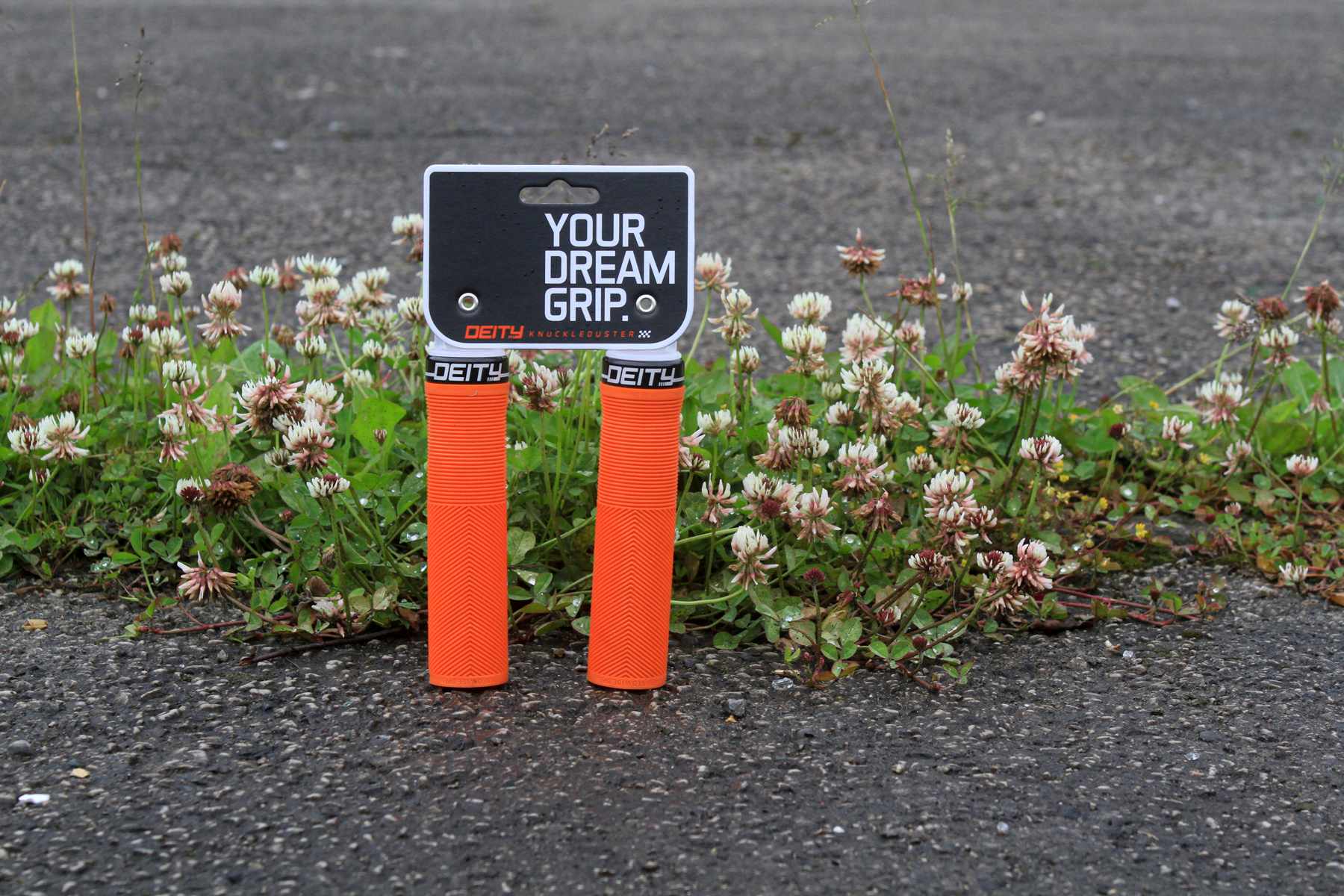 The Knuckleduster grips from Deity unfortunately don’t offer any actual knuckle protection, but they do feature a tapered inner sleeve for contact with the bar and a short rib design to ensure there’s no side-to-side action. They come with installation instructions, Whack Three Times, a variation of the classic Knock Three Times.