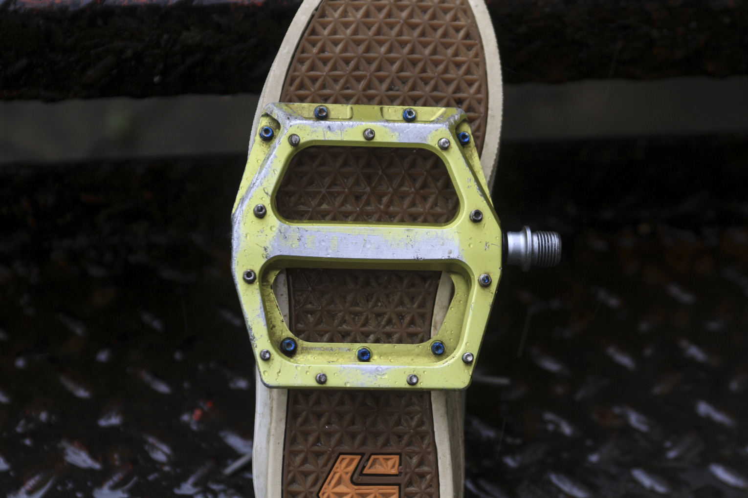 The narrow shoe means that the pins don’t have a great probability of striking pins on the wide platform, which the hex pattern seems to result in the pins sitting on the surface of the tread rather than digging in. In addition, the hex pattern is like mini inverted pyramids, so the Vault pins (and others) struggle to sit inside the tread and dig in. Mated up with pedals with skinnier pointer pins that fit into the hex tread more easily did seem better, which is great if you like pointy pins, but generally I tend to ride DMR Vaults with quite long but blunt ones – largely because I’ve found that pointier ones are inclined to do me rather a lot of damage on even the briefest shin encounters.