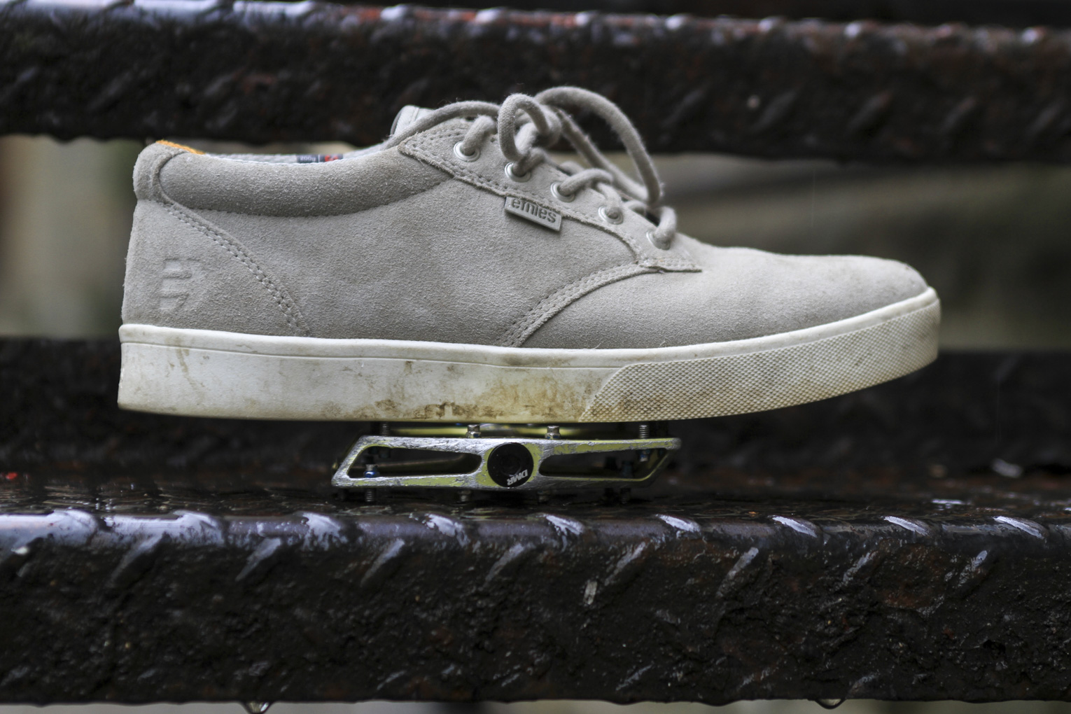 Coated with Scotchguard the Etnies Jameson Mid Crank do a decent job of shrugging off splashes – sure, you’ll get wet feet eventually if it’s really soaking, but that’ll take a bit of doing. You can even get your feet muddy, and once the suede dries, the mud brushes off – even the pale grey shoes still look very acceptable, and they’ve certainly not been treated gently. I didn’t even clean them up especially for these photos, and they’ve previously been as muddy as any other mountain bike shoes I’ve owned. I’m actually really impressed by how these shoes have stood up to the weather, and I’ve even found myself reaching for them on wet days into town, as I know they’re so much better in the rain than my usual trainers. They’ve also got an Thinsulate layer in them, giving your tootsies a little extra warmth.