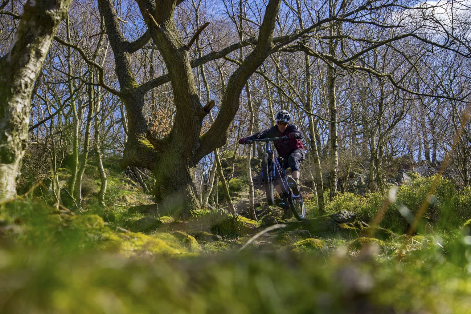 After the first couple of runs take us through thin oak into tall pines, we’re into what is quintessentially Wharncliffe. Every photo I’ve ever seen of this place looks exactly as I’d imagined it. Old twisted oak trees have found their way through the mess of gritstone boulders and give the place a unique charm. It’s here where Steve’s smile is the widest as we make our way through to the more technical parts of the woods, and where the gap between us on track is even greater. While we might have sampled bits of everything Wharncliffe can offer, where things get more sniper and technical is when Steve really starts to make me small in the rear view mirror – clearly this is where that particularly accurate riding style comes from. Going offline here would spell disaster, and that can be less than a tyre’s width either side of the main line.