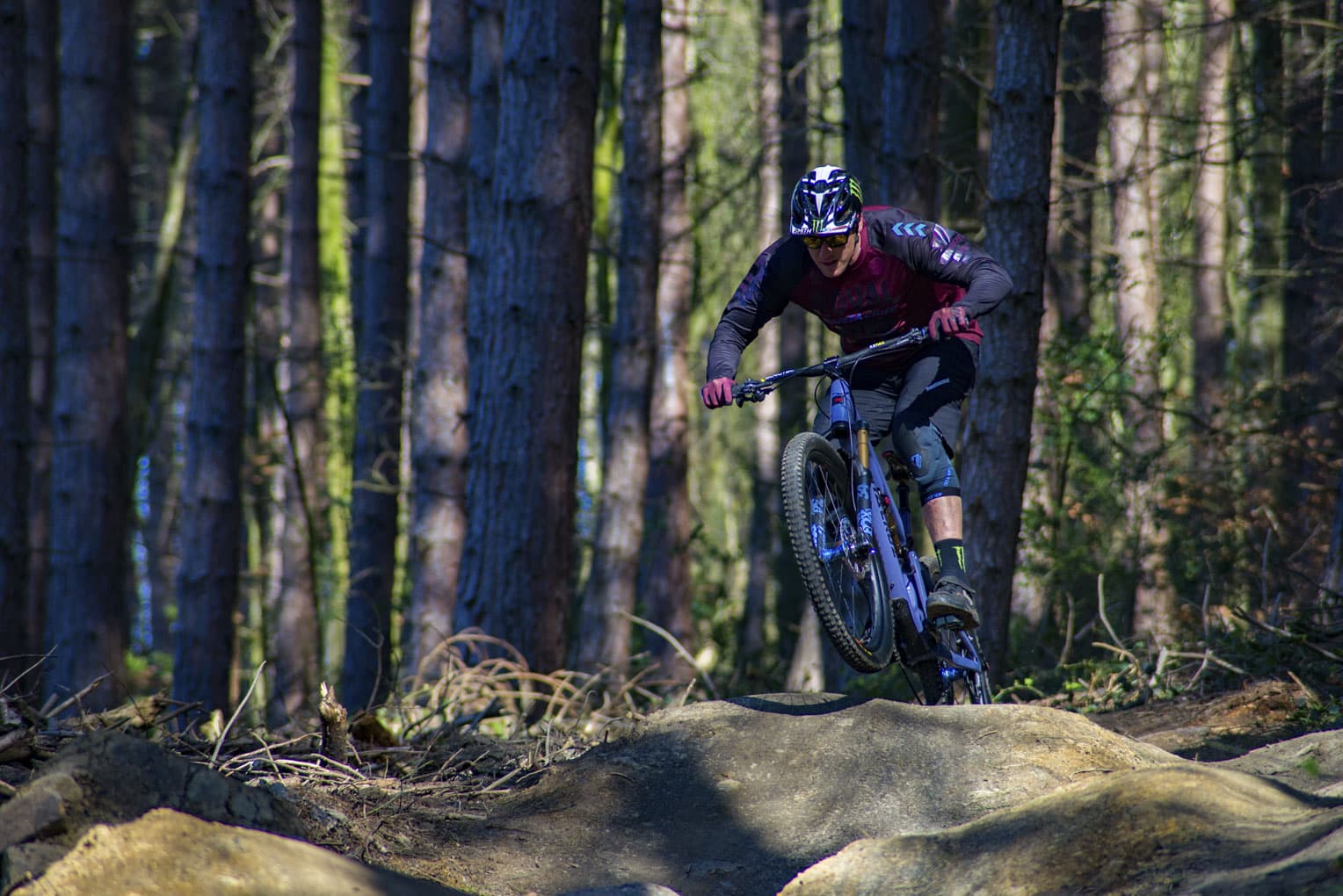 Steve’s riding is smooth and, accurate – more than I can say for mine. He clearly knows the trails here better than most, and has the skills to attack them. There’s an eerily quiet quality about Steve’s riding. Riding blind on technical trails while trying to keep the gap from becoming embarrassing is no mean feat. Despite the multiple square edges, you can only hear the buzz of a freewheel coming from the big man ahead as he effortlessly scythes his way through whatever is in front of him. It’s impressive to watch.