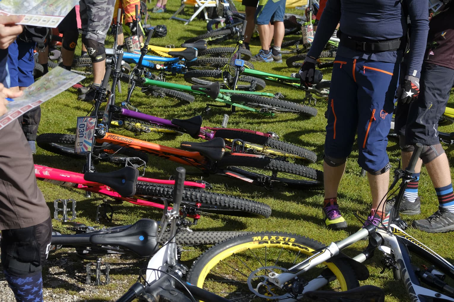 The idea of the Dumpling Hunt will be familiar to anyone who’s done a Trailquest, or Polaris or any other bike orienteering event. A marked-up map was distributed a half-hour before the mass start. We were gathered at the chairlift station on top of the mountain, while hundreds of metres below us the town of Selva still sat in shadow. All around us soared sheer mountains slopes and scattered around a fairly wide area were checkpoints. The idea was to navigate your way around the mountains, collecting checkpoint stamps (in any order, and in some cases, doing forfeits or games of skill to earn them) before returning to the valley below with your ‘passport’ stamped in time for the prize-giving and dinner (naturally, of dumplings…).