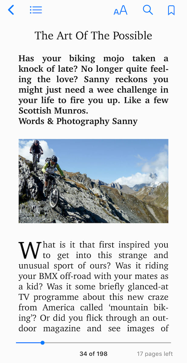 We format each issue of Singletrack magazine to display on Kindles and iBooks (iOS). In fact any device that will open an ePub file will give you access to all our words. There’s a few select images thrown in for good measure and our eBook versions are completely free from all advertising.