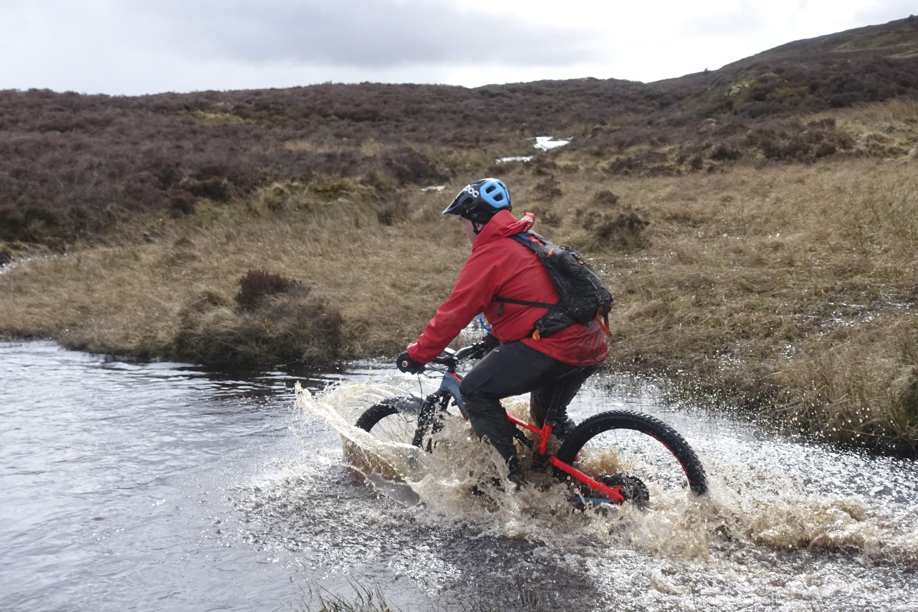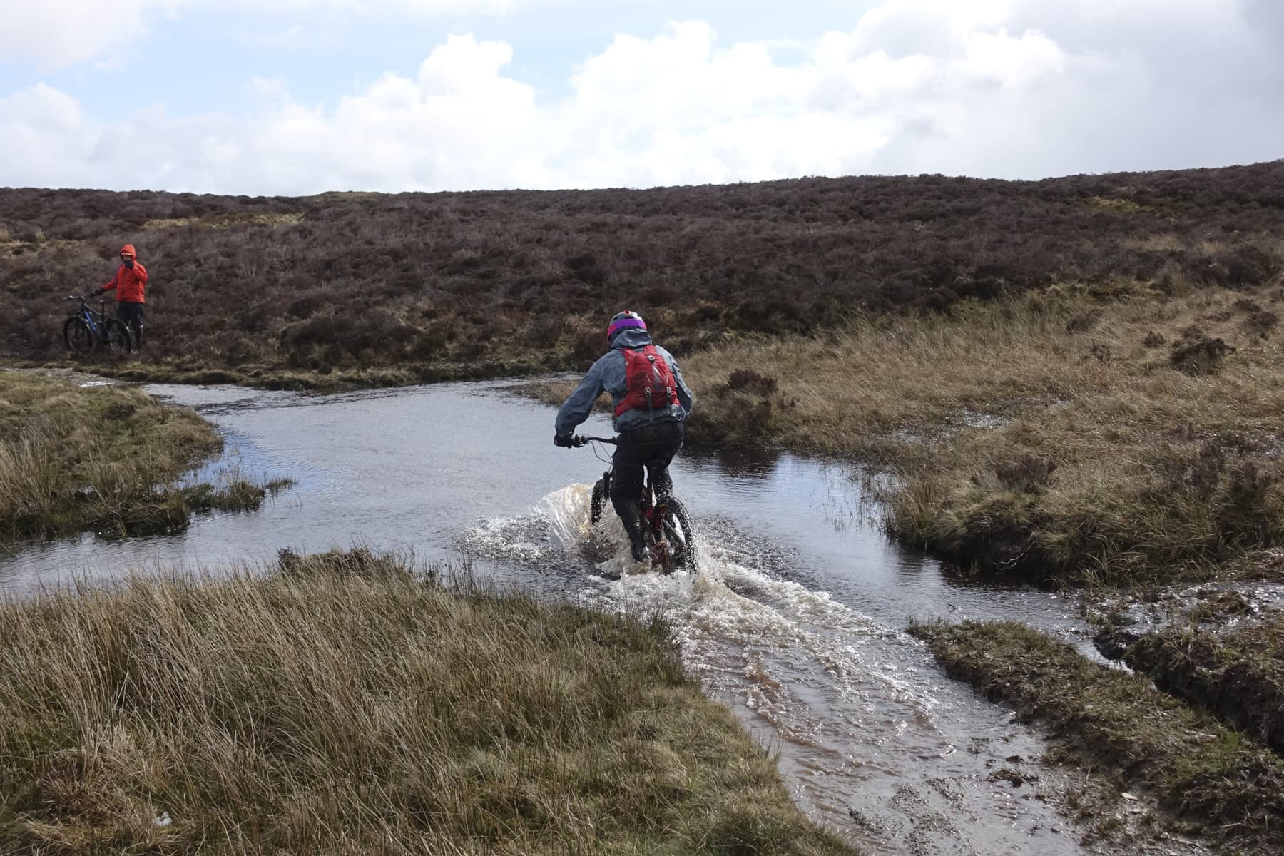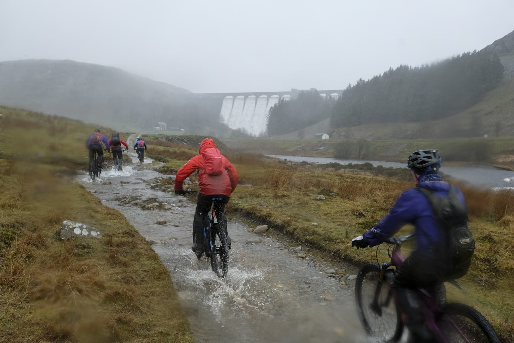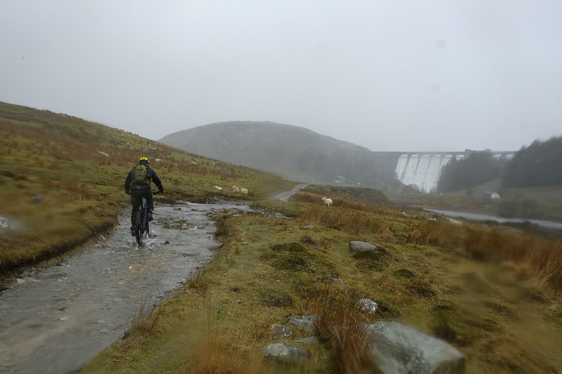 With the first chunky climb over and the trail now contouring ahead, the bikes were due to be tested next. Our route to the bottom of Claerwen Dam followed an old sunken way, which today (and to be fair, on many days) was literally sunken, with the wide trail indistinguishable from the swollen river next to it. All thoughts of dry feet were gone as riders splashed and splooshed through the flooded track. A couple of sections were knee depth and prompted some off-piste navigation, only to find boggy marsh of similar soppingness. Ahead lay the enormous dam itself, with water thundering down its face.