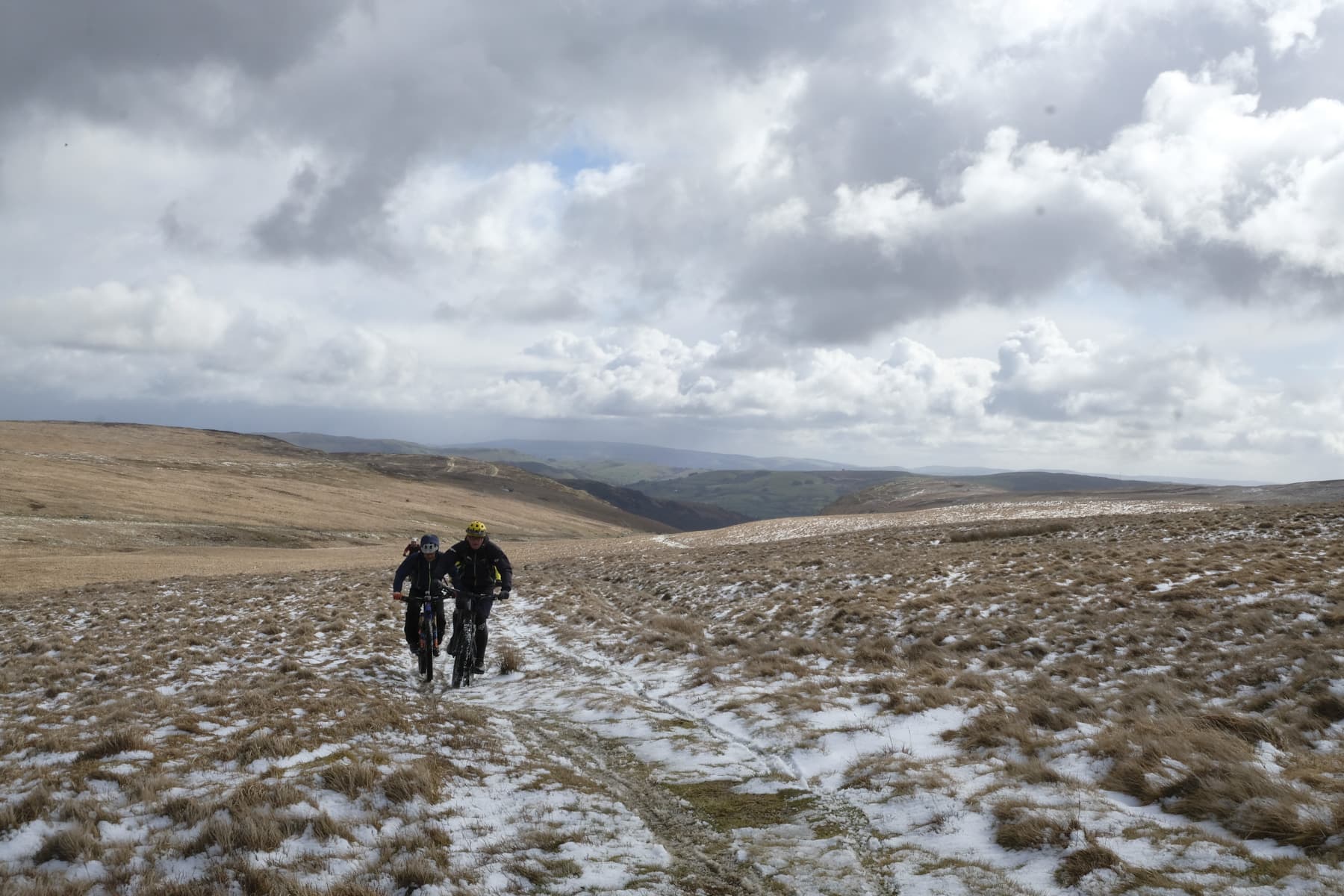 With the next climb and long, exposed moor-top, the relative energy levels of the riders were evident as the pack strung out along the trail. Electric power, though, does at least give you the motivation to just get your head down and get on with it. We soon left the blustery hilltop with rain sheeting in from the sides to reach the relative shelter of a long, wooded descent. And while the relatively high weight of an e-bike can help force those tyre knobs into the soft dirt, that same weight, unless corrected, can commit you to directions you weren’t particularly planning on. Unscathed and elated at the bottom of the slick descent, we hightailed it for lunch, warmth, and an hour of recharge for the batteries at the visitor centre.