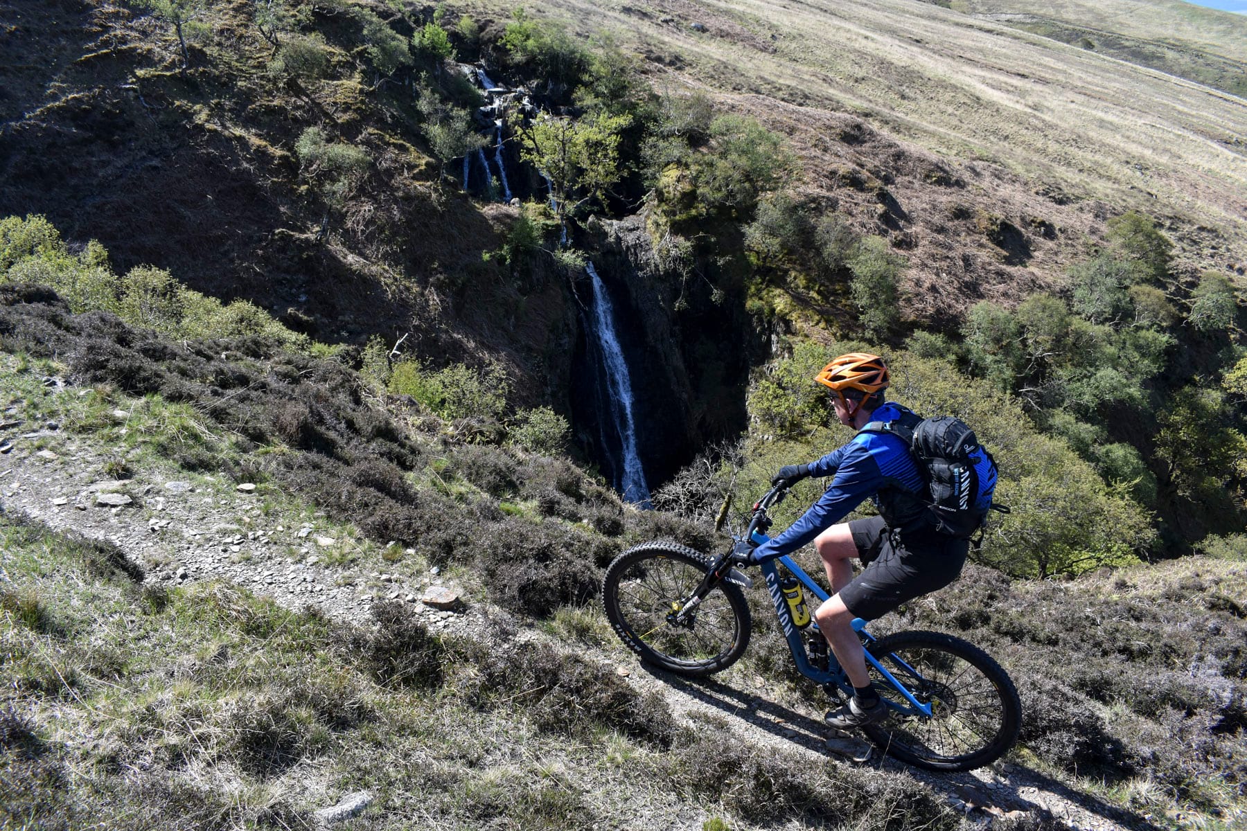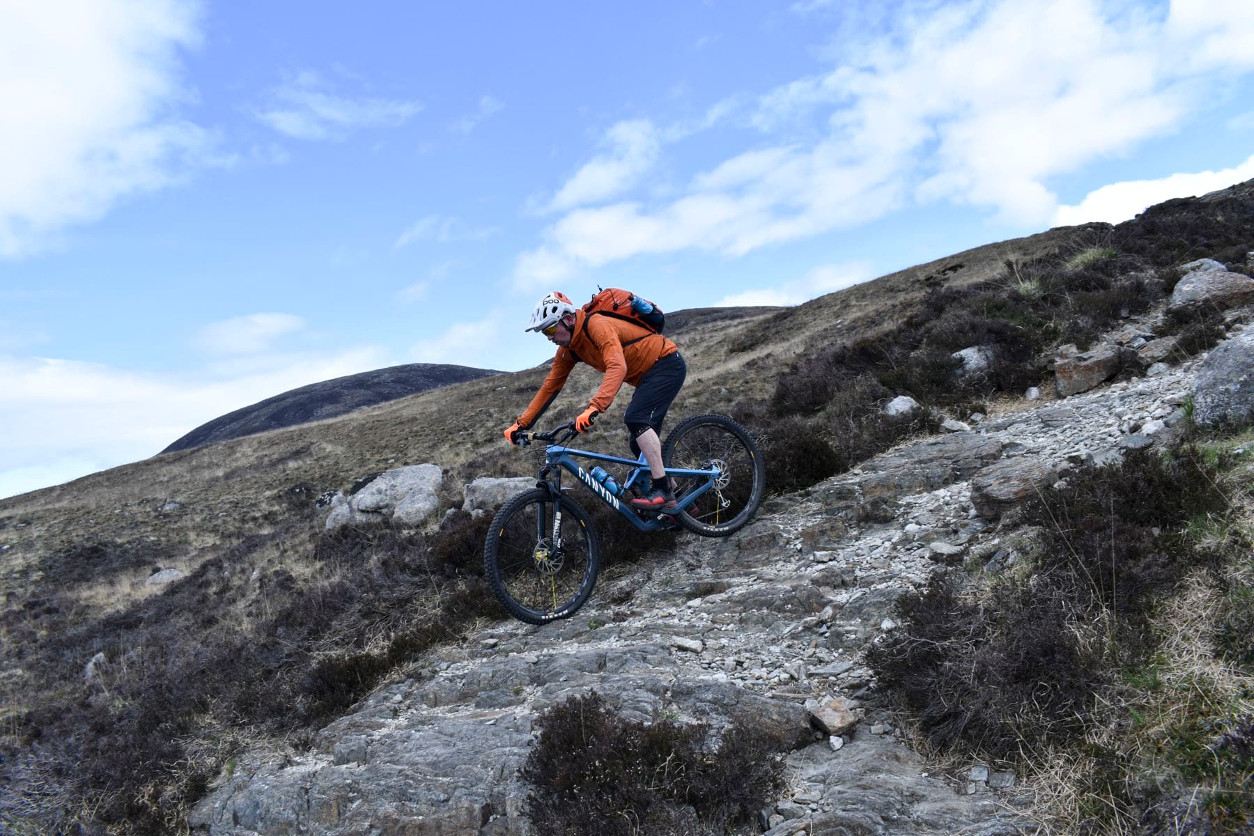 Remounting, we found ourselves on an upgraded section of trail. Clearly a bit of a tourist hotspot, the path has enjoyed some recent renovation. Normally this would spell doom for the rider seeking their technical thrills but in this case, it has been done to perfection. A fast and flowy first section with obligatory Scottish stream as constant companion led us into a series of steep slabs, stepdowns and square edges that kept us on our technical toes. It was nothing short of brilliant. Reaching one particularly steep section, we happened across a couple of chatty female walkers who cheerfully suggested that if we managed to spanner ourselves, at least they were doctors so we would be mostly fine. “Or perhaps not so much me, as I’m a gynaecologist!” said one. I glanced at Dave and steeled myself for a suitably Tourettian riposte. Rather like a sleeping Father Jack, with such an open goal, you just know that something wonderfully inappropriate is going to be uttered. “You’ll be fine, Sanny. After all, you are a bit of a fanny!” Thankfully, the walkers laughed at this comic interlude.