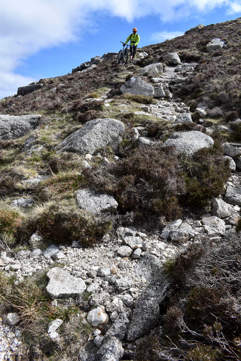 Practically giddy with excitement, adrenalin carried us effortlessly to the final summit of the day. What gems would it bring? We didn’t have to wait long to get our answer. Where previously there had been no clear path, a sliver of a trail wound its way into the distance. Clearly we were now on the busy and bustling walkers’ route of choice as we made our way past a vast crowd of (well, three) fellow travellers. Descending at a fair rate of knots, I found myself humming tunes out loud. A good friend, Graham, had suggested singing as a way of relaxing on descents and on this showing, he was bang on the money. Like Yoda on a bike, but with smaller ears and a little bit taller, I could feel myself relax and just let the bike flow beneath me, which was probably just as well as the tech came thick and fast. A steep, narrow channel peppered with half-exposed rocks and loose gravel added a bit of spice to the proceedings before being quickly followed by an expanse of gloriously grippy bedrock at the edge of the corrie, the lochan far below drawing our eyes. Grippier than the grippiest, grippy thing that has ever been grippy, Dave and I messed about for a few minutes riding it several times to find the optimum and funnest line.