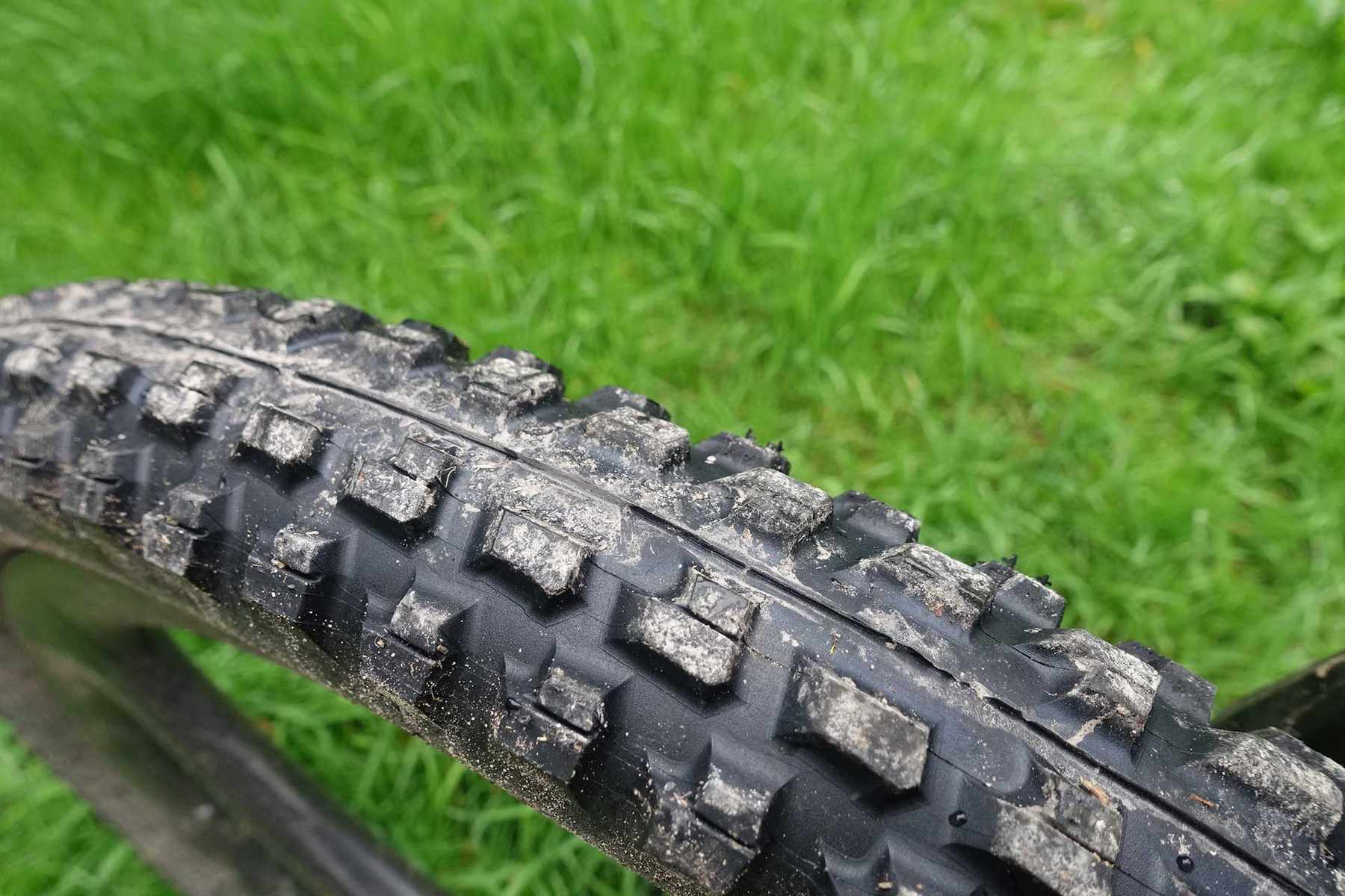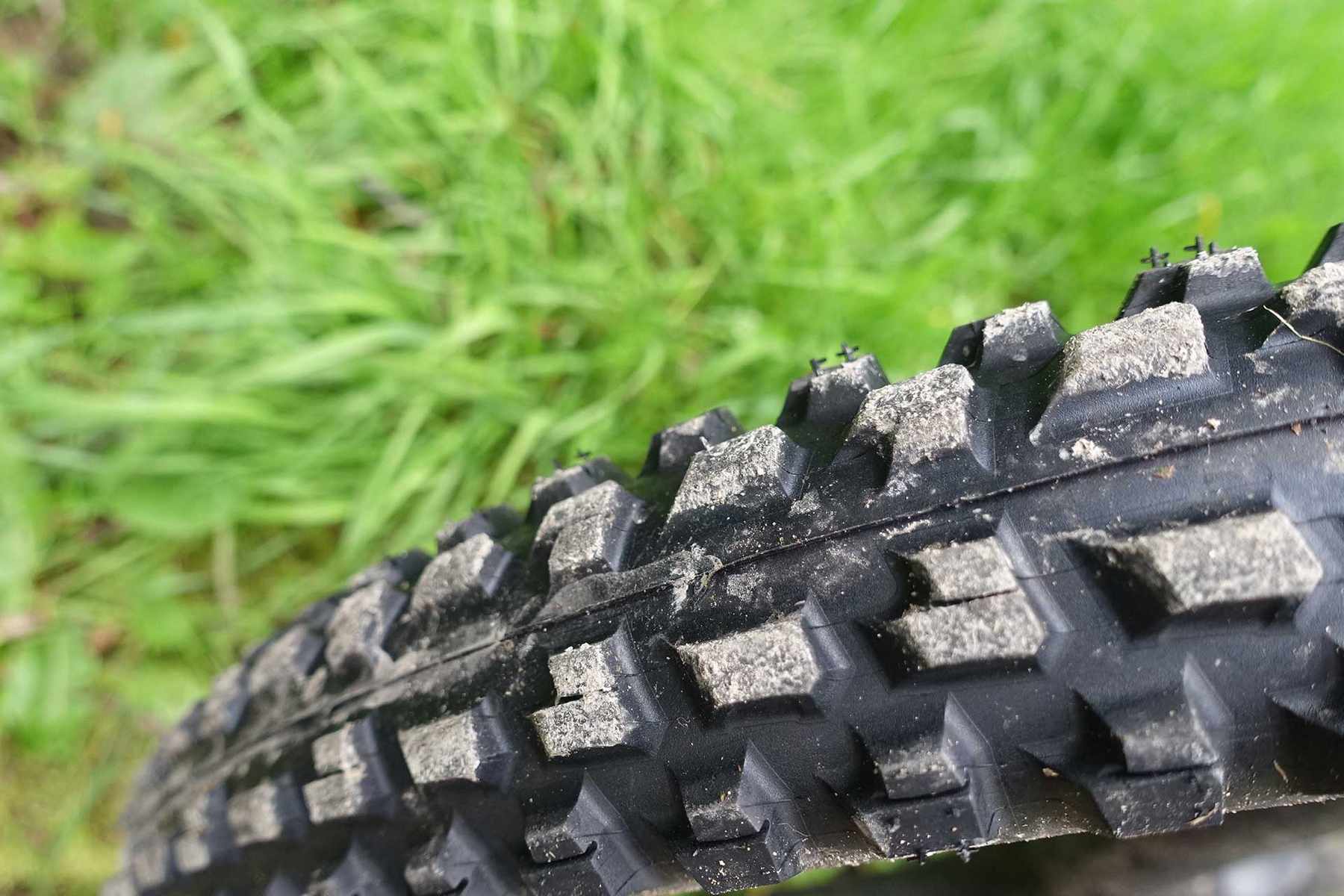 The tyre itself will come in both of the sizes (sorry 26ers!) and in a uniform 2.50in. Our test tyre looks pretty chunky and we’ve measured the tyre to be 2.5in across the carcass, so with the outside knobs, it’s more like a 2.6 or 2.7in tread. It’s certainly a beefy tyre. We forgot to weigh it before installing it, but Tioga is aiming for 1kg for the FlexGrid 60 casing on a 27.5in and a little less for the Magnum 120 casing.