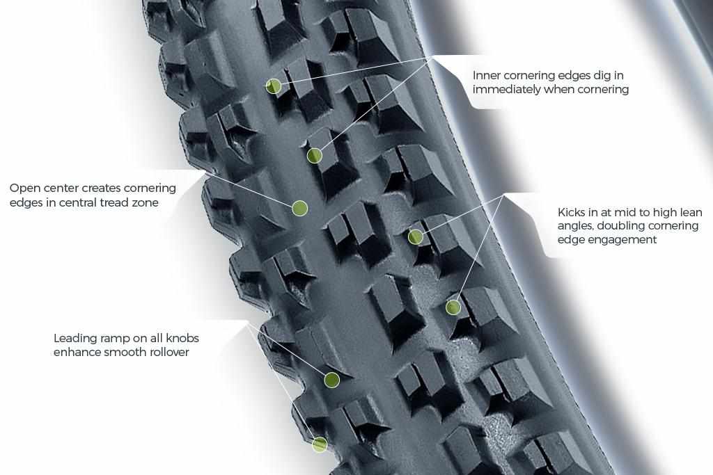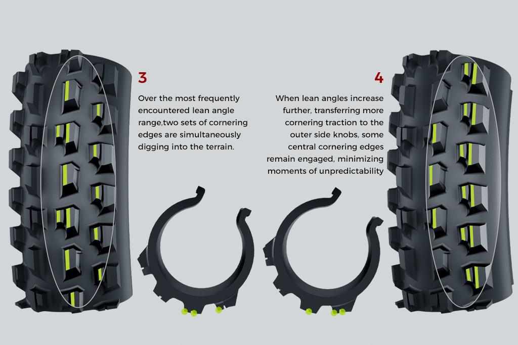 Tioga has done this on the Edge 22 in order to use the inner edge of its mid knobs as cornering knobs too. As the bike leans, the mid knobs are immediately in contact with the ground and biting in, as this handy set of diagrams show. As the lean angle increases, the outer knobs start to become involved, until at extremes, you’re only on the edge knobs.