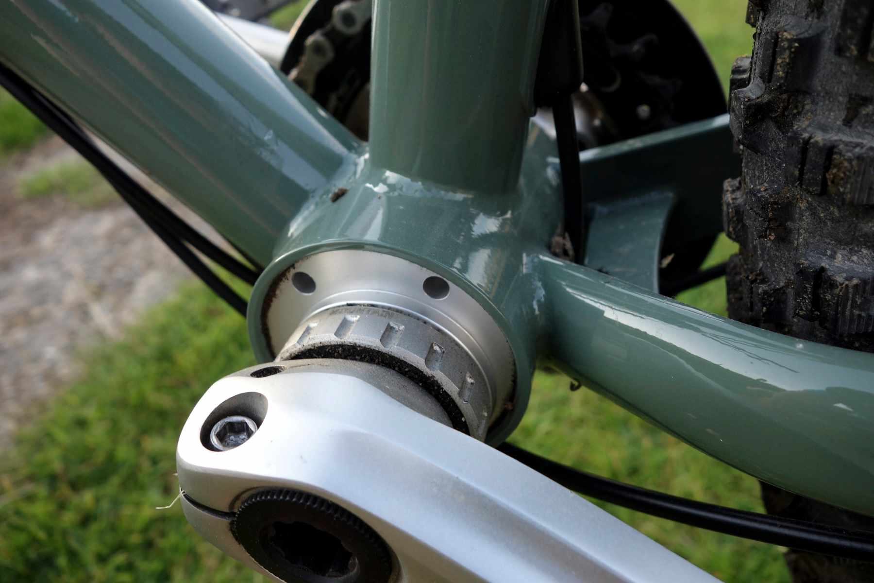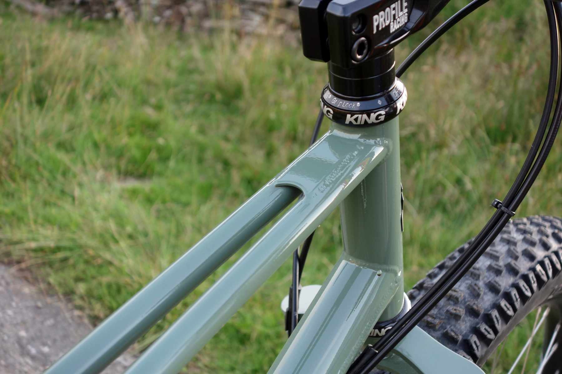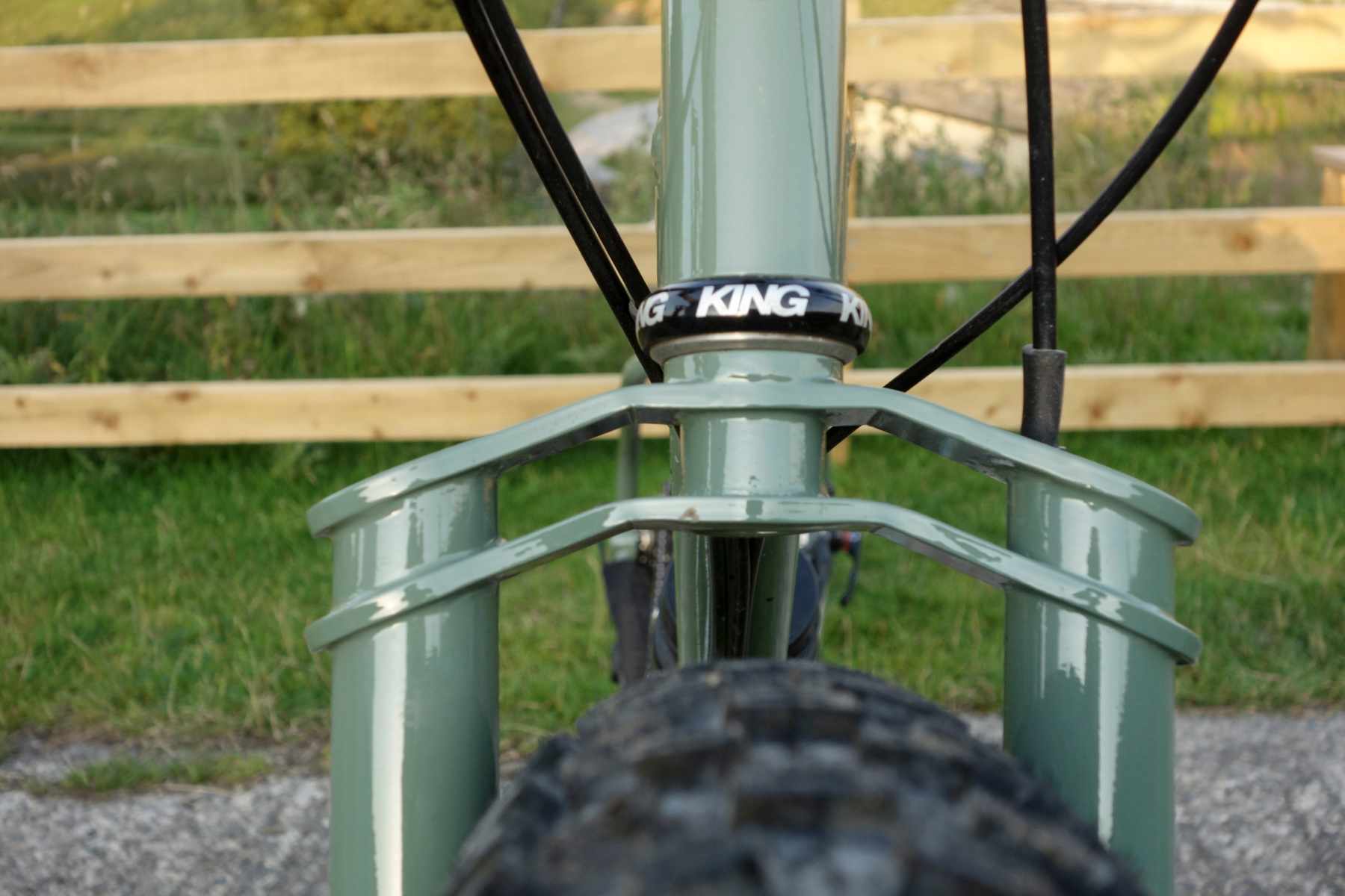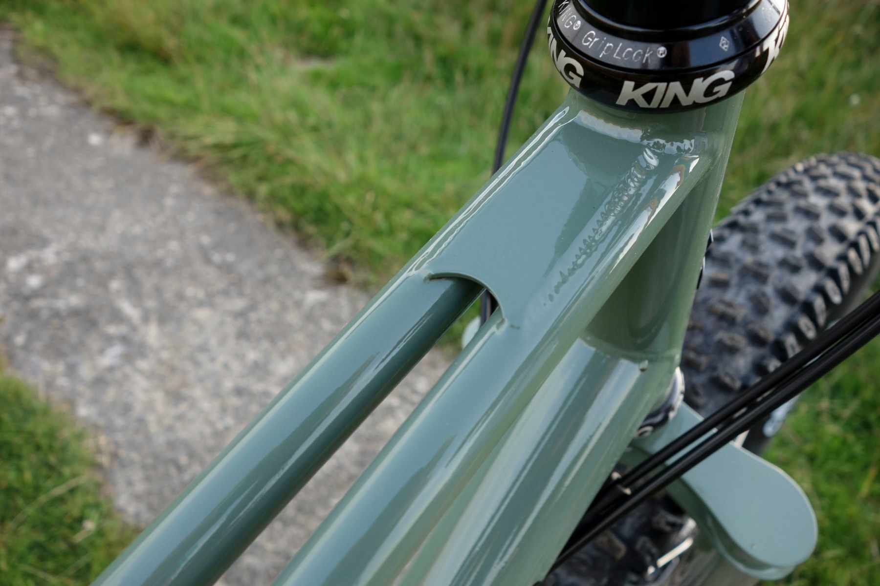 This frameset is available in ‘Duster Blue’, Red, or this ‘Moss Green’, but only one size. It has a 625mm effective top tube, and a 18in seat tube so you can add a nice big long dropper – or have your saddle really low. Stealth dropper routing is there, as are triple cage mounts on the downtube and fork legs.