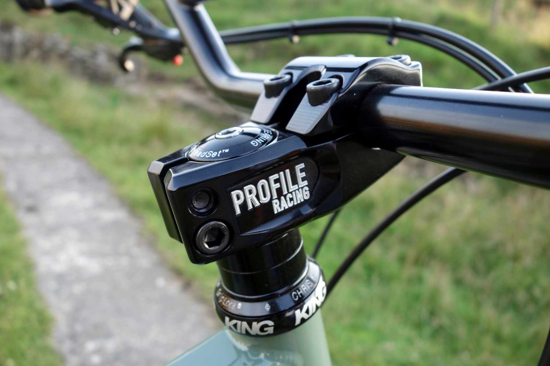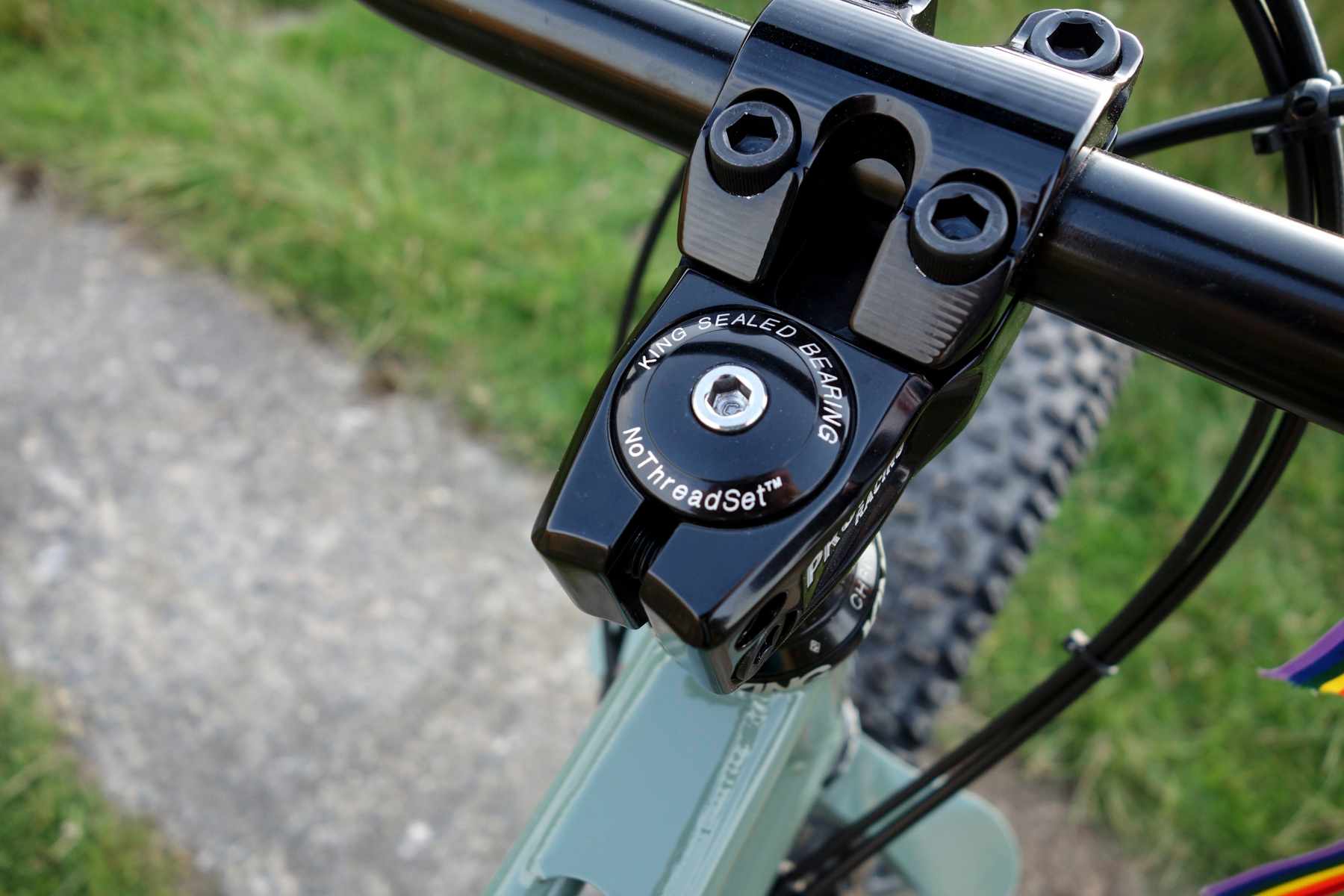 The 66 degree head angle and 80mm offset keep the trail figure fairly low for light and quick steering and reduced flop, and this model is longer in the top tube than previous Stooges, giving you more room to move about within the bike. It’s designed to have a 29+ tyre up front. The bars you see here are the new Junker bars, built from 4130 steel with a 20 degree sweep and 820mm width. They’re specifically designed to compliment this frameset, but Andy says they’re ‘also just a badass modern klunker bar’.