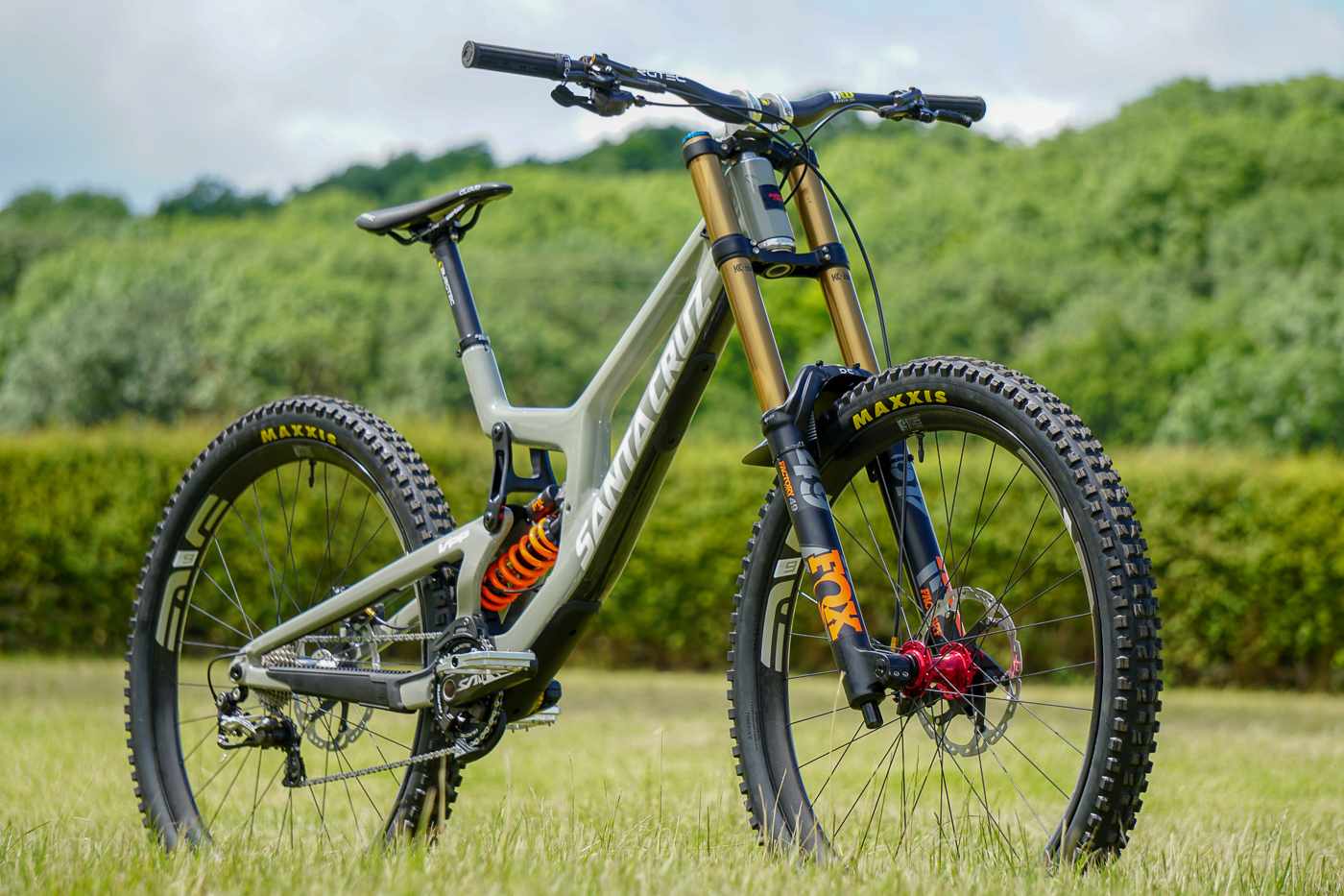 The Megatower gets a pretty similar build to the V10 above, with ENVE rims, Maxxis tyres, Fox suspension and a Burgtec finishing kit covering bars, pedals, grips, and stem.