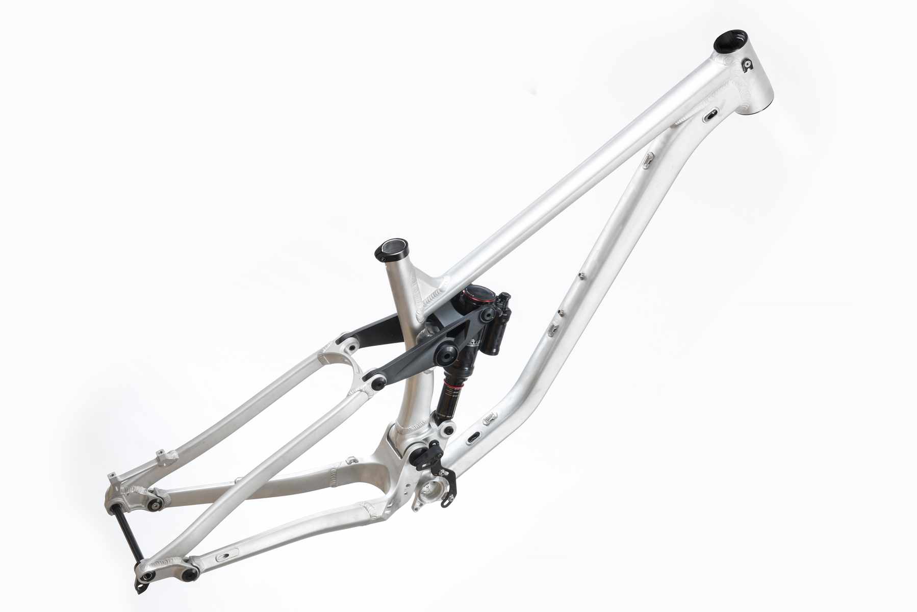 Being a UK based company, they’ve thought about the trials and tribulations a UK bike faces, and designed the suspension for high durability, with large 15mm axles and large diameter ball bearings on two front triangle pivots. There’s wide bearing spacing to reduce sideways torque forces – very important for bearing life. There are three bearings in the main pivot, with two on the drive side. Since drive side main pivot bearings always have to sit in-board due to chainring clearance, Tom says two bearings will share the load and increase wear life. All bearings are fully enclosed and double contact sealed. It’s a one piece CNC rocker link, rather than two or three piece welded, keeping bearing and frame alignment accurate and increasing strength.