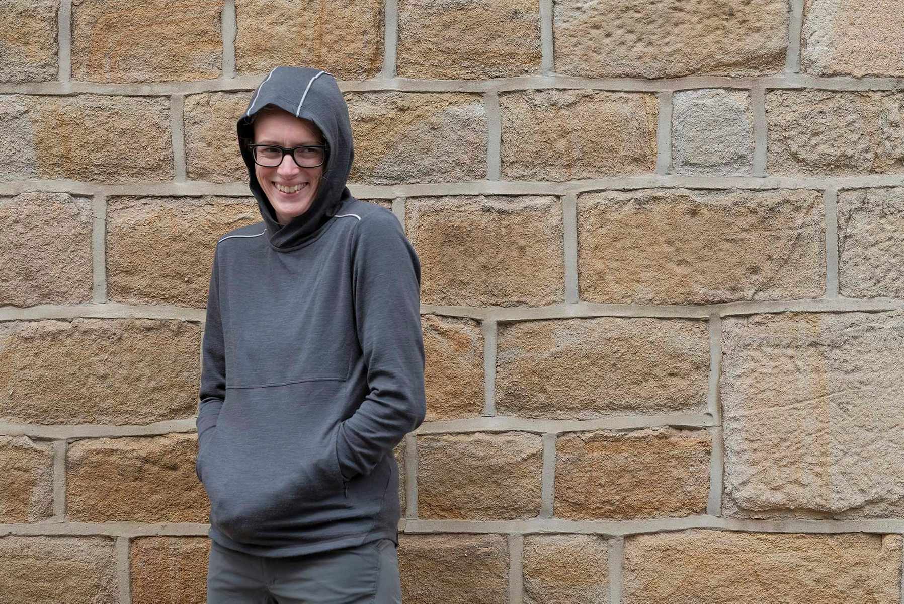 The main body of this t-shirt is 50% merino, while the side panels are 87% merino, to help stop your stinky bits stinking. There are reflective tabs on the shoulders, front and back, on the seams between the grey and blue fabrics. It’s all very nice and soft and drapey, unlike Hannah’s hair, which clearly needs some serious attention.