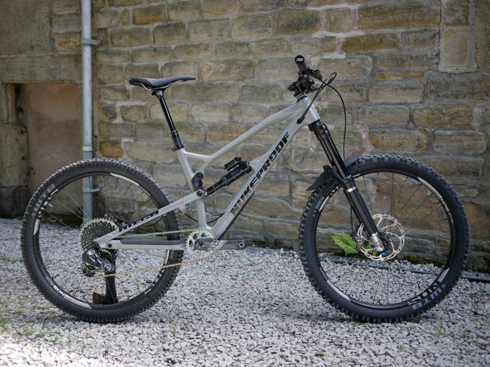 Not all wheels are big, and we have a 27.5in FS beast here. It’s been a while since we had a 27.5in-not-plus bike in, and here we have one. And it’s dripping – in a selection of exciting test parts, including the Hayes components you saw in FGF last week, plus some Manitou items you’ll see below.