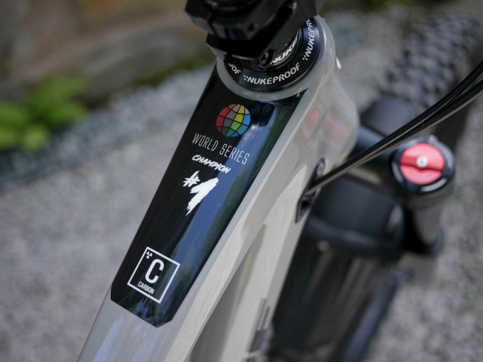 We’re going to practice our hot seat sitting. This is the Enduro World Series winning frame, made from carbon, and coated in the crushed hair of ancient wizards, for added magic and that perfect grey finish.