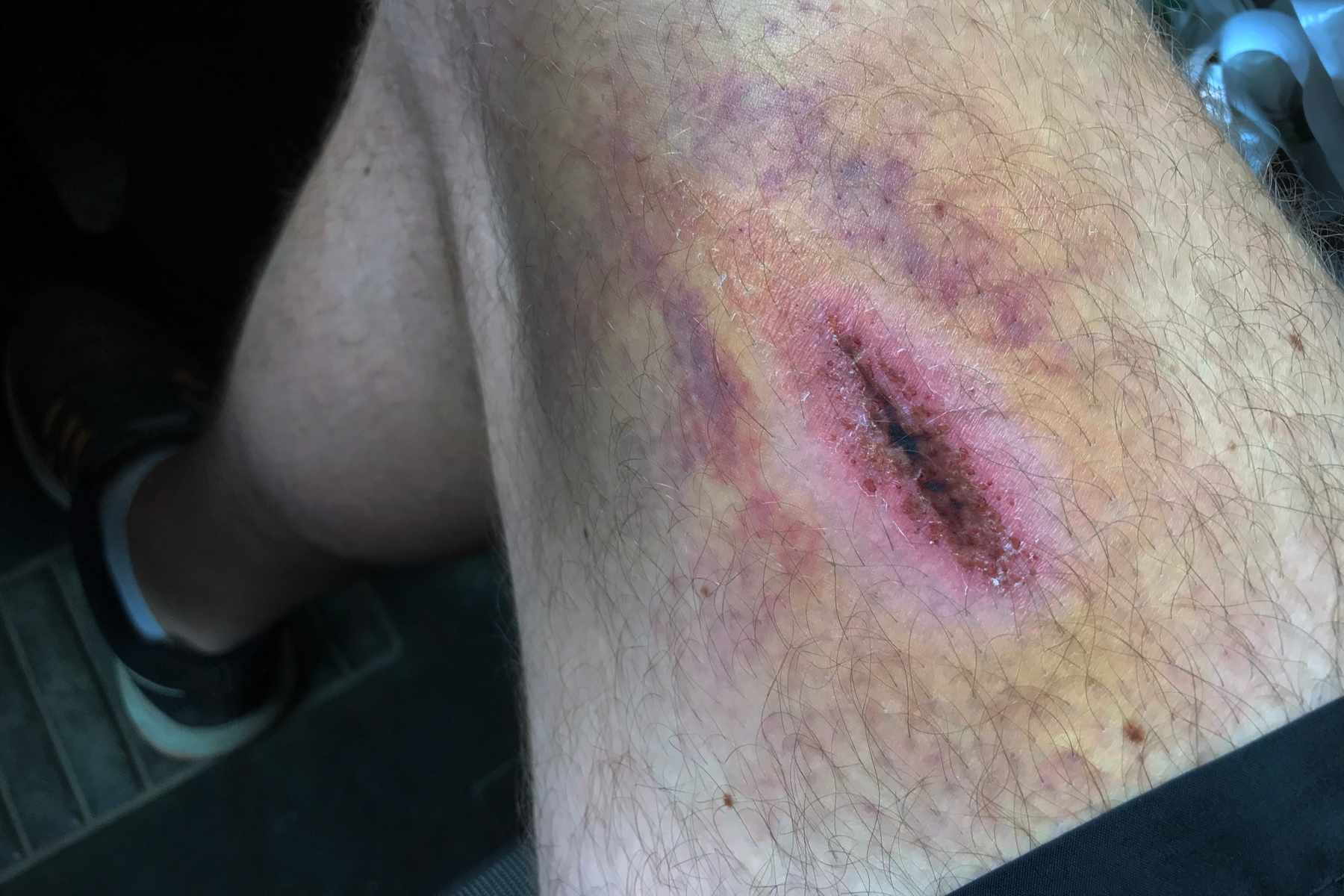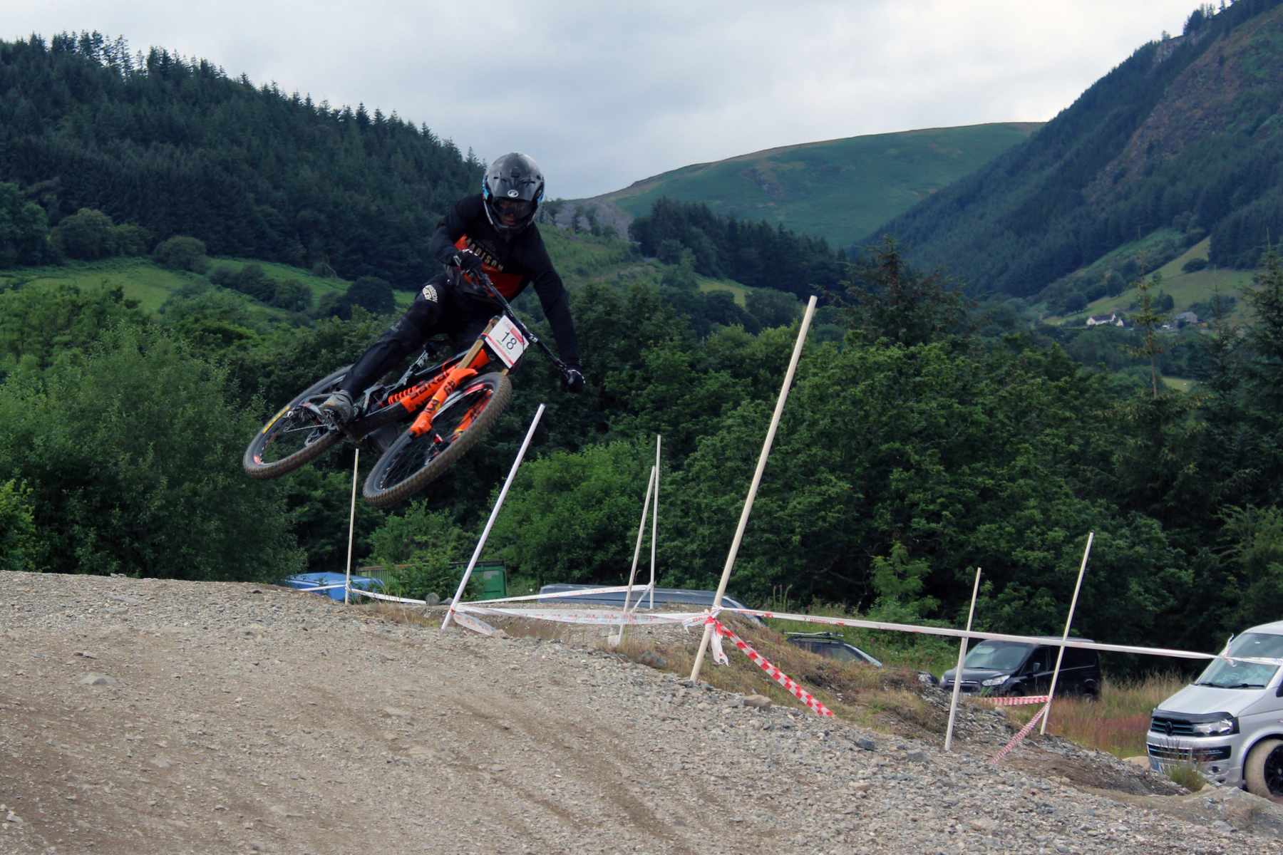 The plan is to get three runs in if we can but on my second I have a pretty big one. That drop after the tight left I mentioned earlier, well, the tight turn went fine as did the drop, but I picked up a huge amount of speed and sailed over the top of the berm at the bottom. My right leg hurts a lot. When I finally dare to have a look at it I see a flash of scarlet right where it hurts. F***ing hell, f***ing hell, f***ing hell. Fortunately, it’s just the lining of the shorts I’ve ripped and there’s no actual blood. Big thanks to rider 300, Matthew Turner for picking me up though.