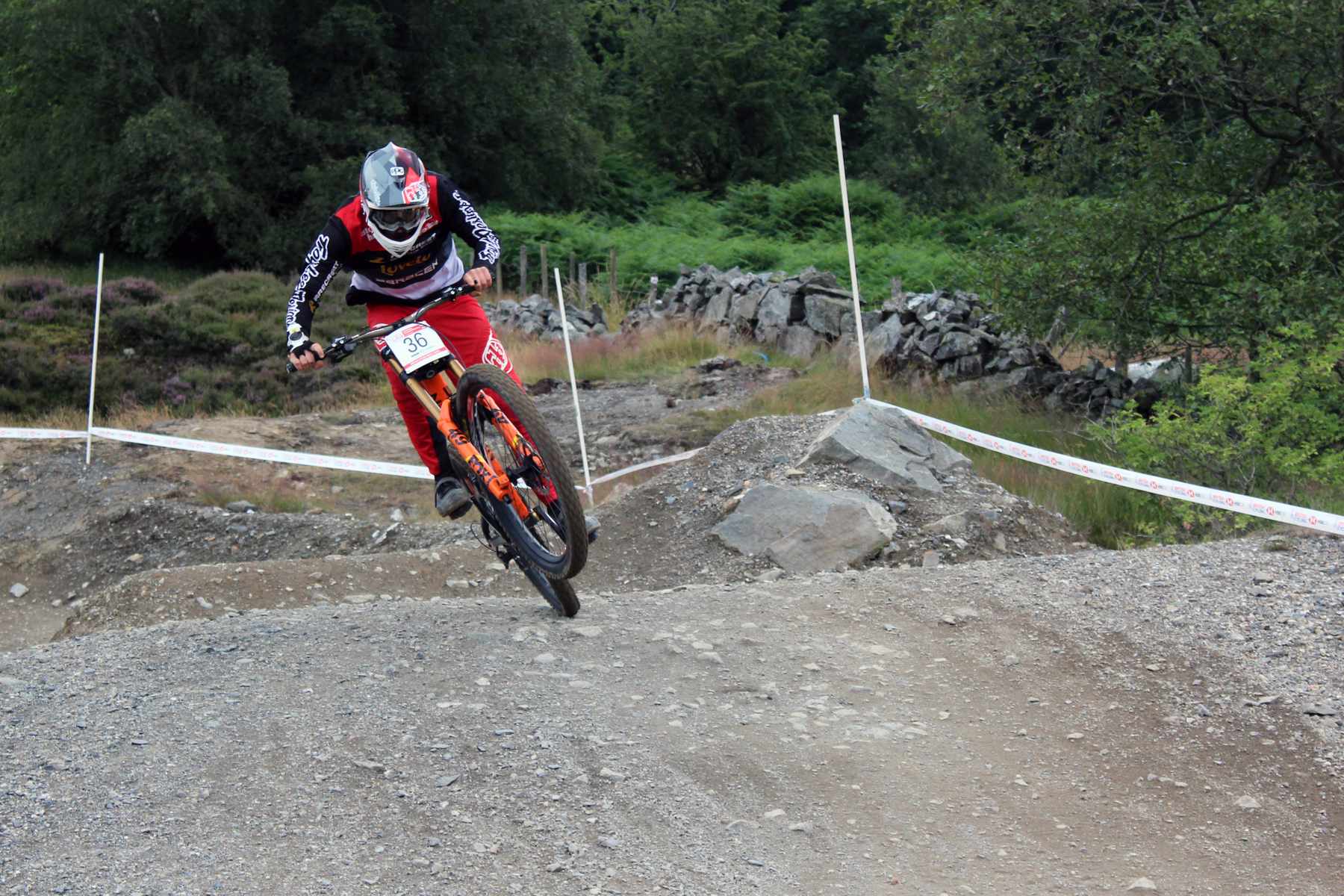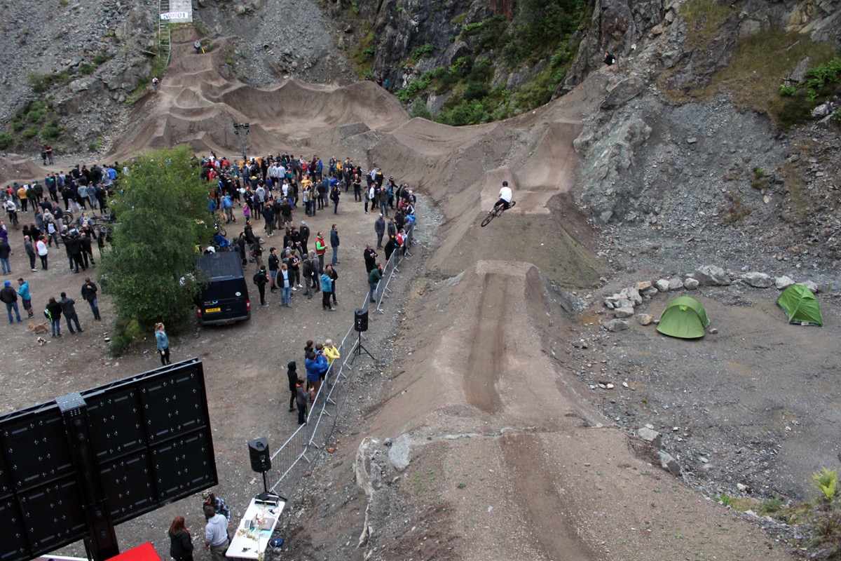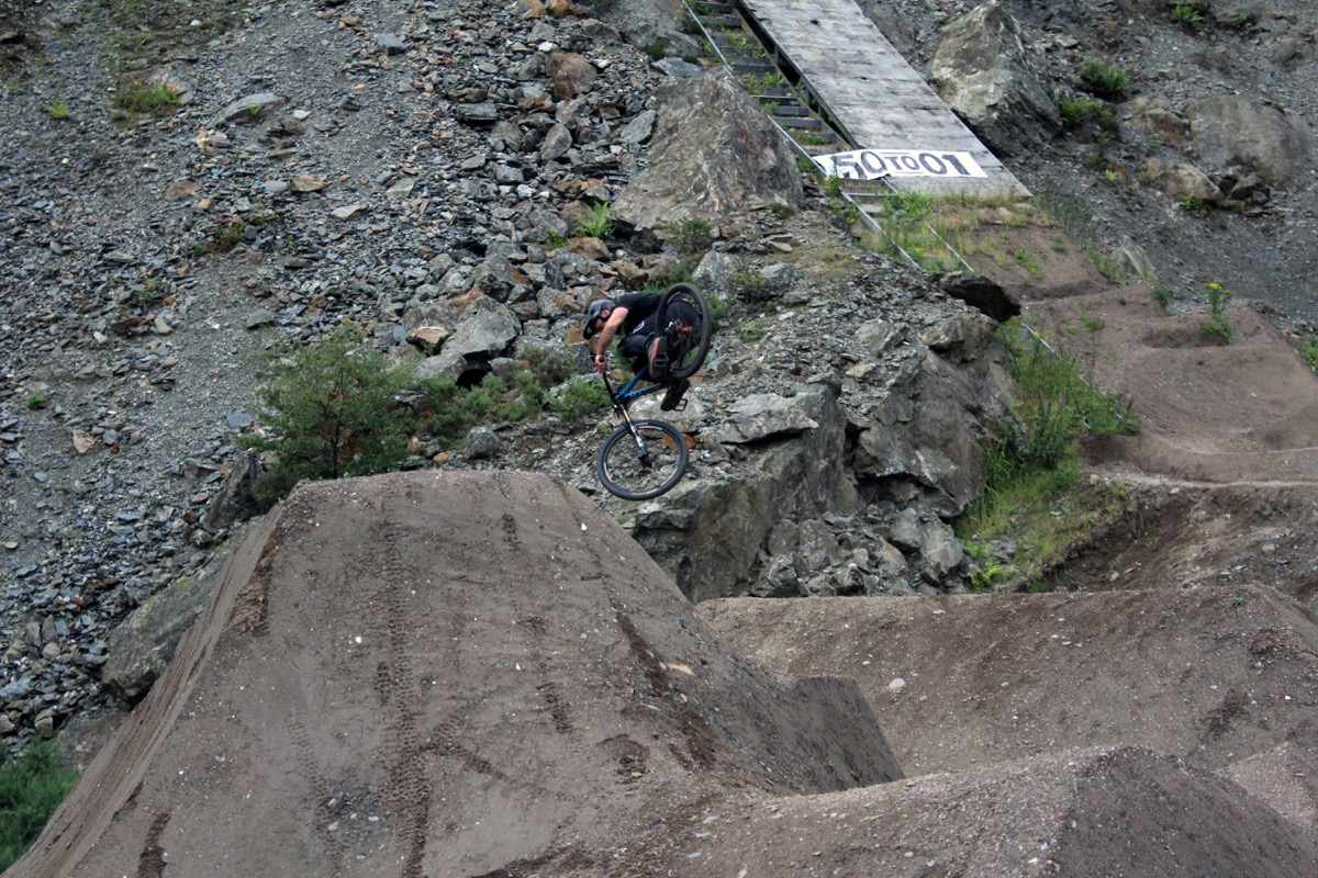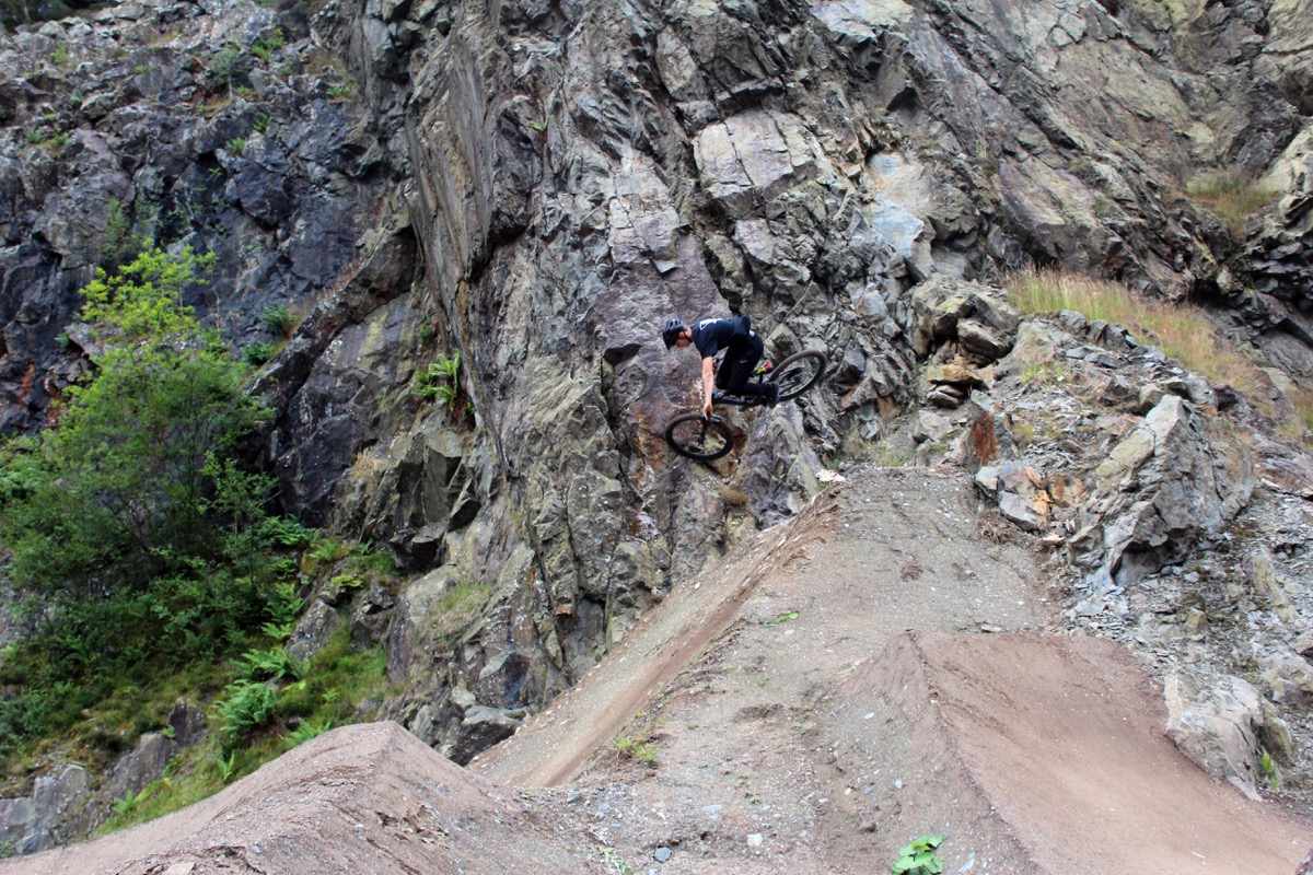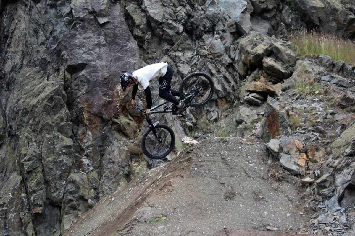 With 300 riders and just the odd shower, the wet mud clears throughout the day revealing the bedrock underneath. Just like the “Ffar Side” and “L1” and all the other natural tracks at Revolution it’s greasy slate and there are sections where you speed up even under breaking. There’s a drop after a tight left in the middle section and its carnage trying to get through there by early afternoon.